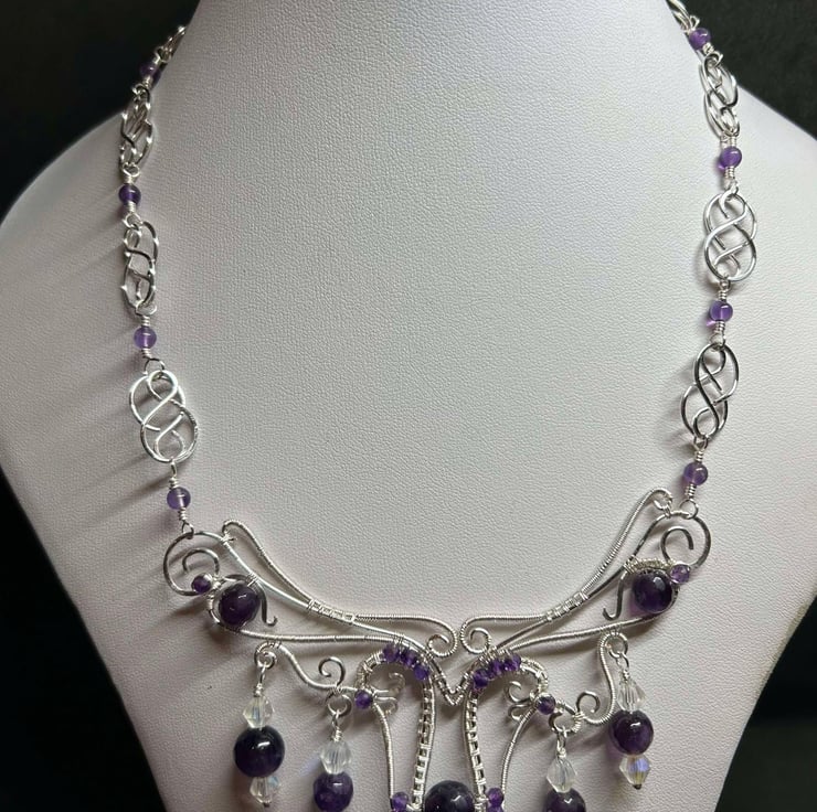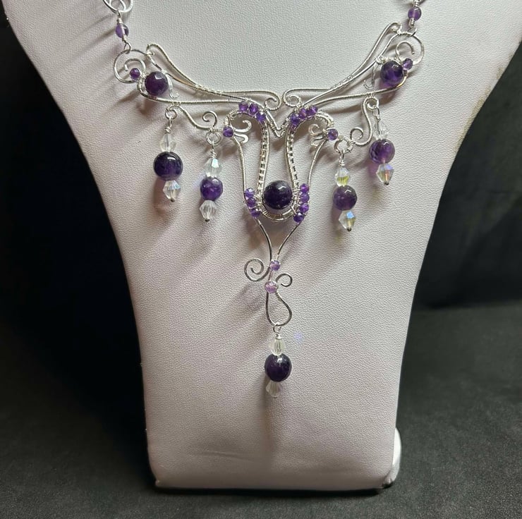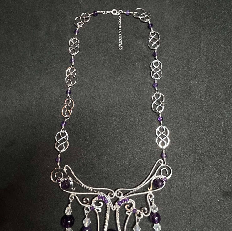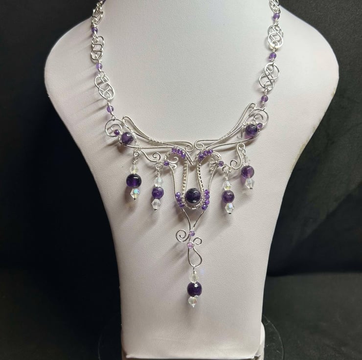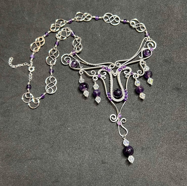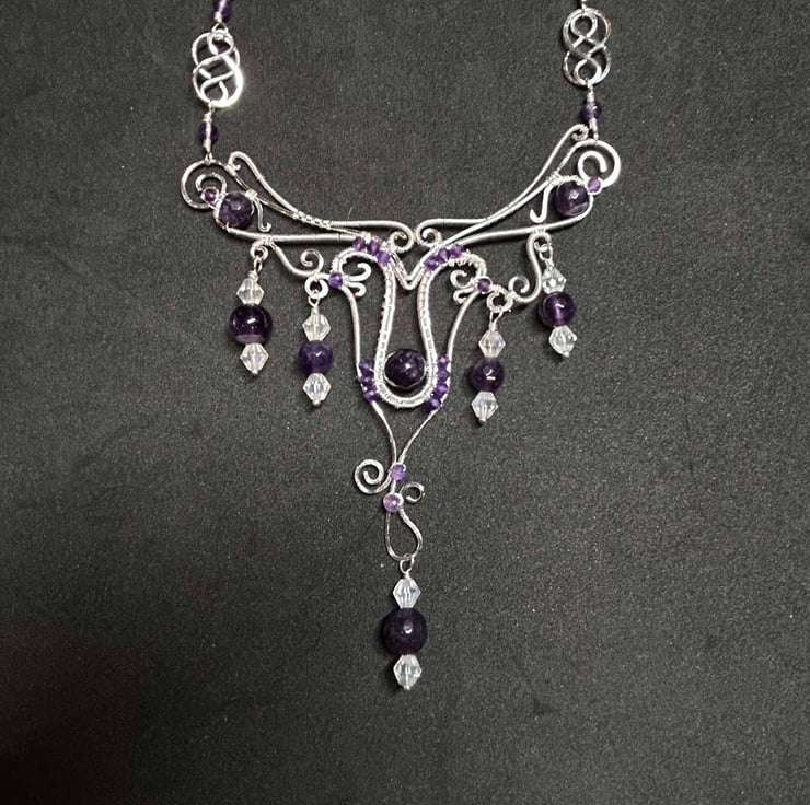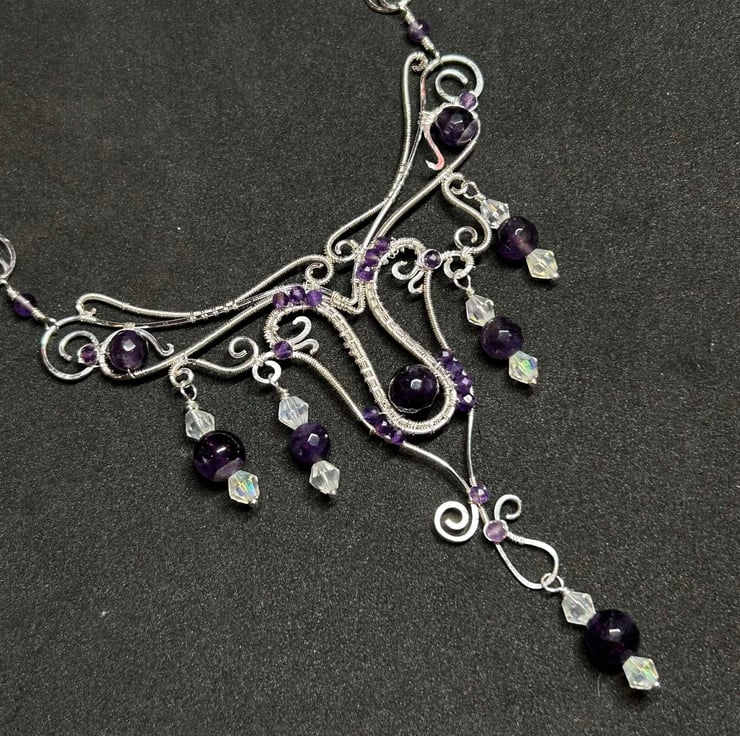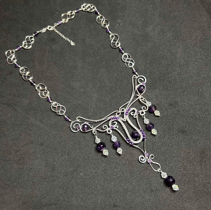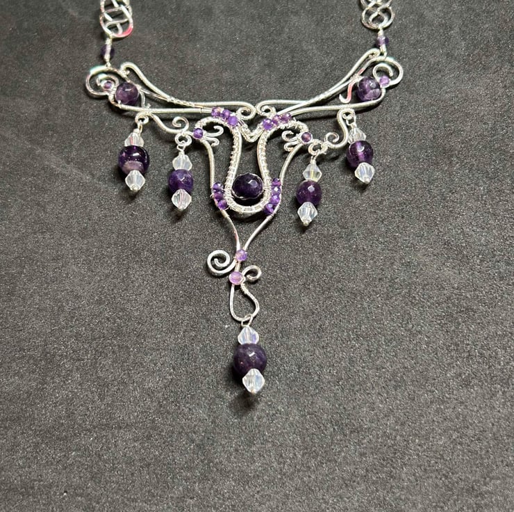 Anwen Wire Wrapped Elven Necklace with Amethyst Gemstones, Silver Plated