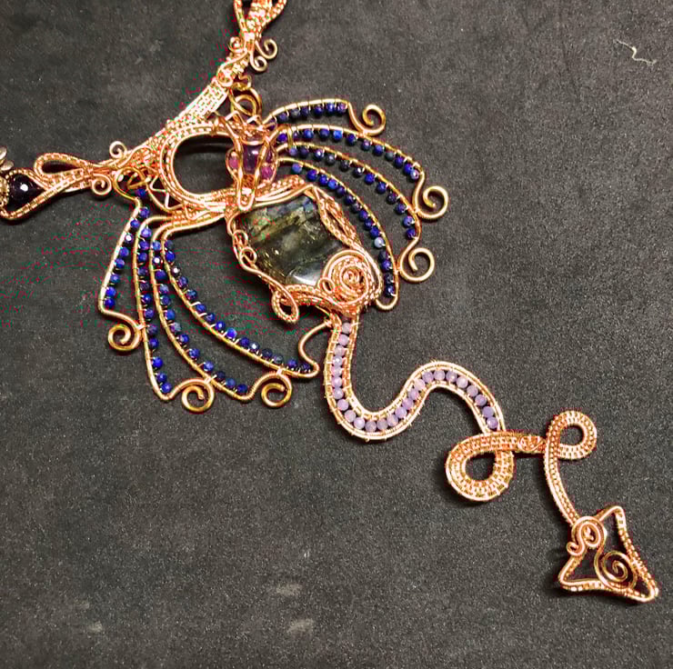 The large dragon, Vhagar, is made from tarnish-resistant copper wire. I set stunning Lapis Lazuli gemstones in the wings, and the body is made from blue flash Labradorite. The coiling tail is set with stunning Tanzanite gemstones and the eyes are made from Ruby. The head is set with Amethyst.