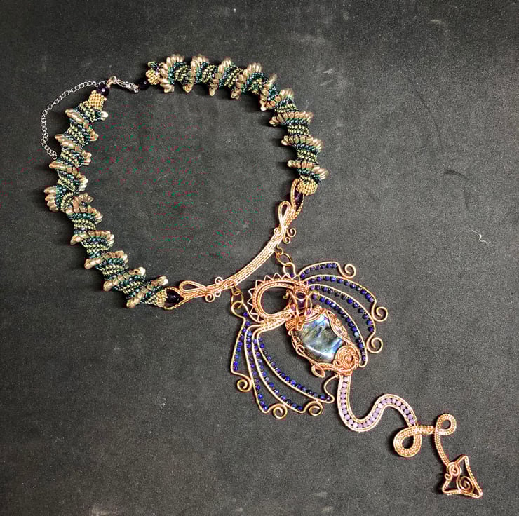 The dragon is connected to a wire-wrapped frame that extends into a highly complex Cellini Spiral made with Miyuki glass seed beads. The Cellini spiral changes direction twice on each side, making it the most complex and difficult piece I have ever made. However, I wanted the spiral to resemble a dragon's tail, and the fabulous neckline perfectly complements the wire-wrapped dragon.