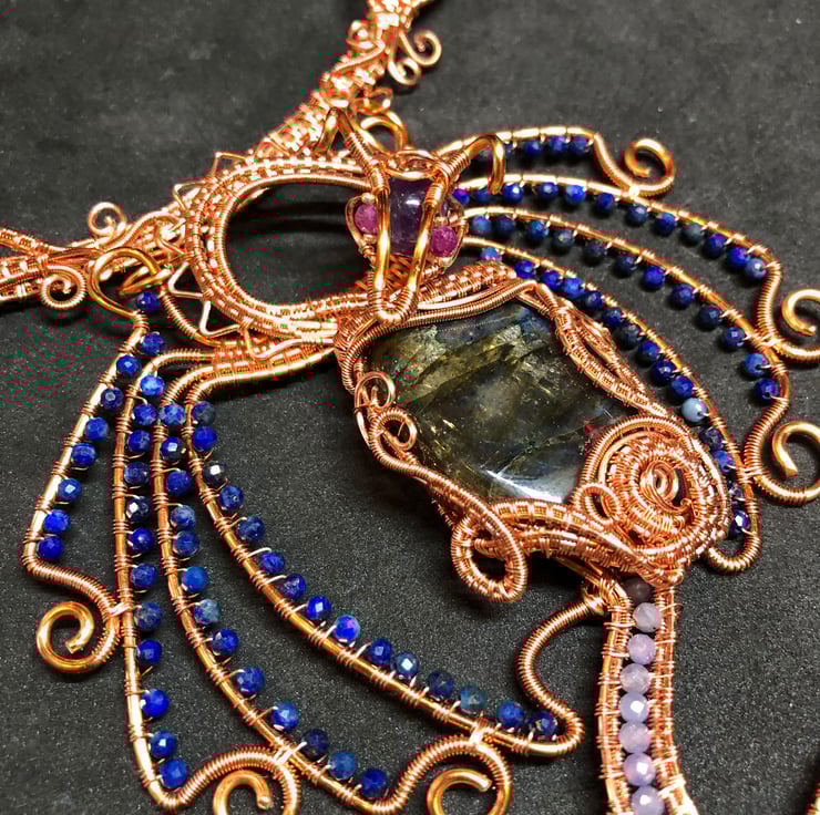 The large dragon, Vhagar, is made from tarnish-resistant copper wire. I set stunning Lapis Lazuli gemstones in the wings, and the body is made from blue flash Labradorite. The coiling tail is set with stunning Tanzanite gemstones and the eyes are made from Ruby. The head is set with Amethyst.