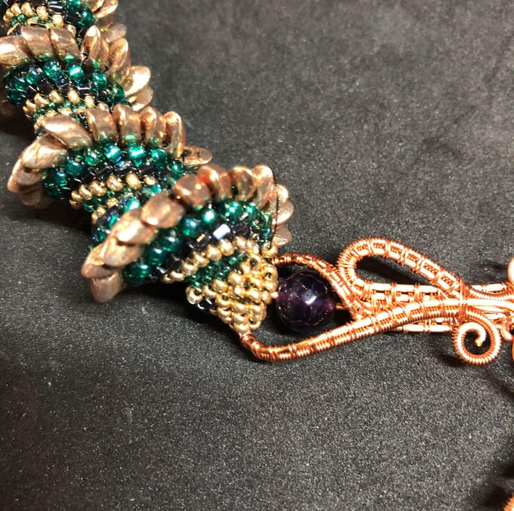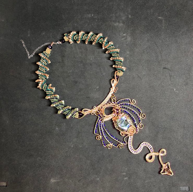 The dragon is connected to a wire-wrapped frame that extends into a highly complex Cellini Spiral made with Miyuki glass seed beads. The Cellini spiral changes direction twice on each side, making it the most complex and difficult piece I have ever made. However, I wanted the spiral to resemble a dragon's tail, and the fabulous neckline perfectly complements the wire-wrapped dragon.