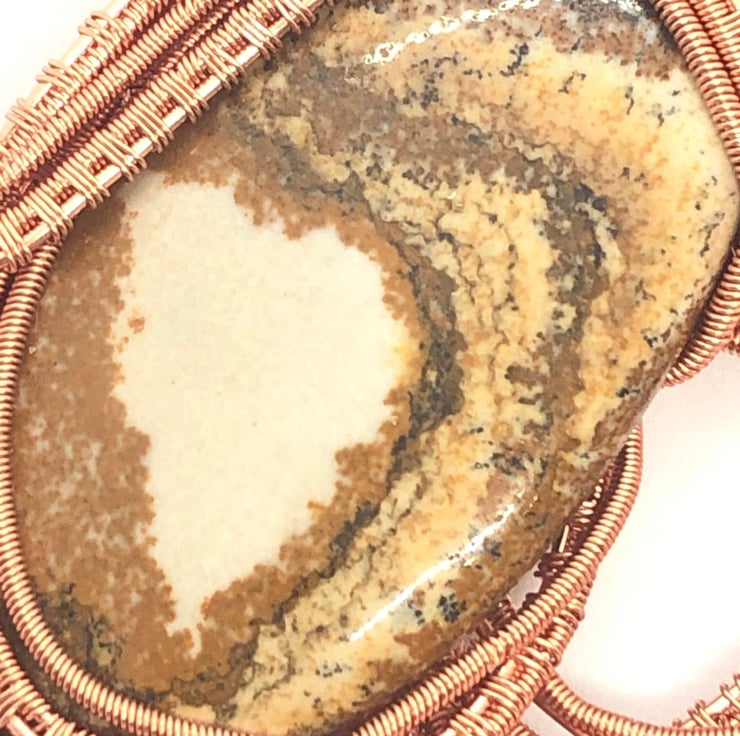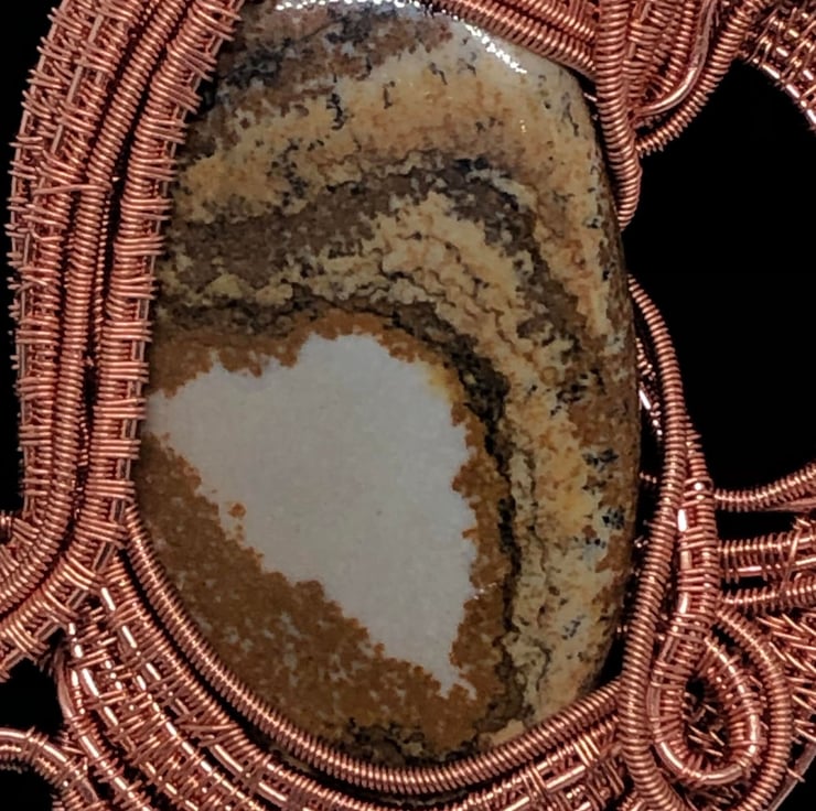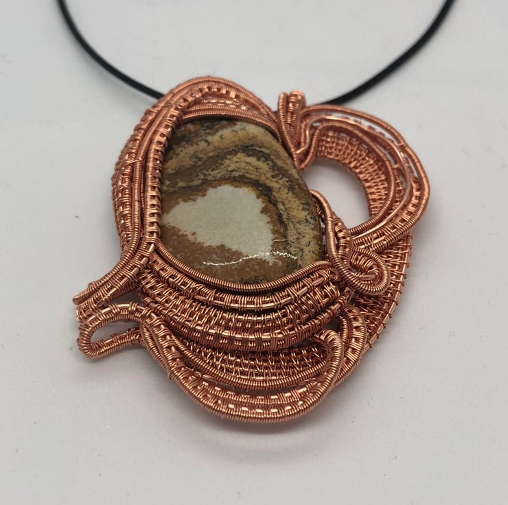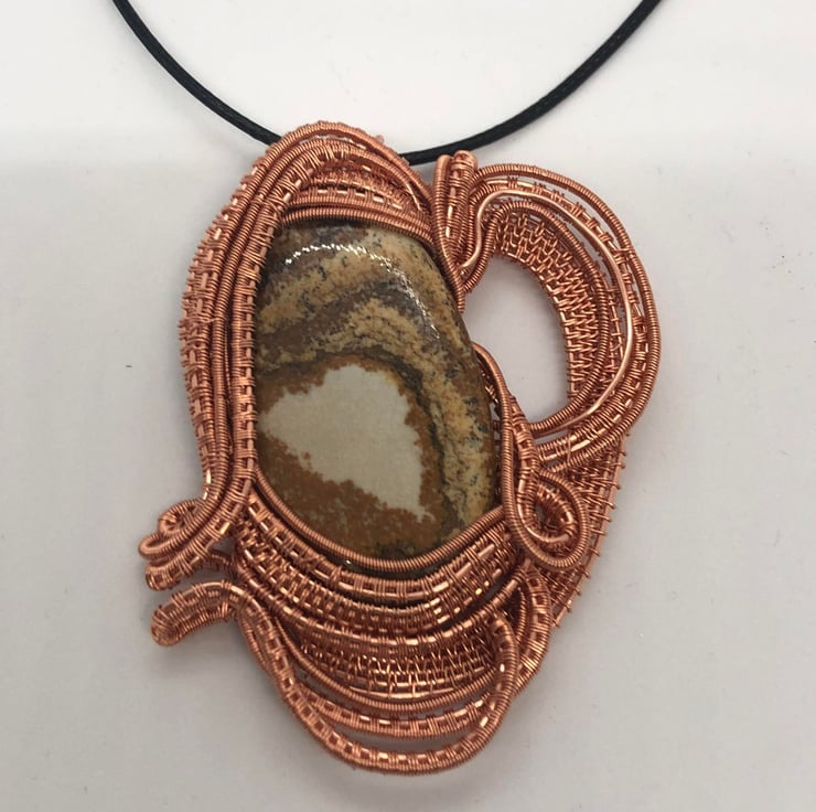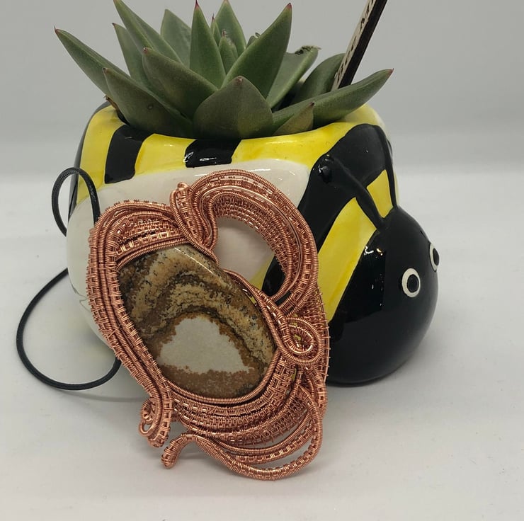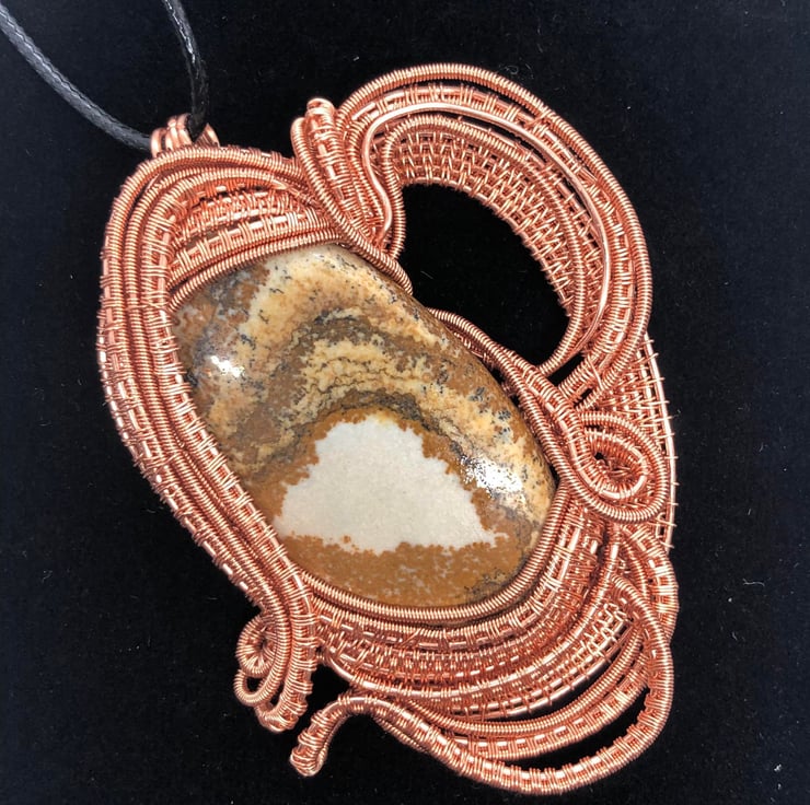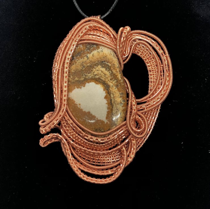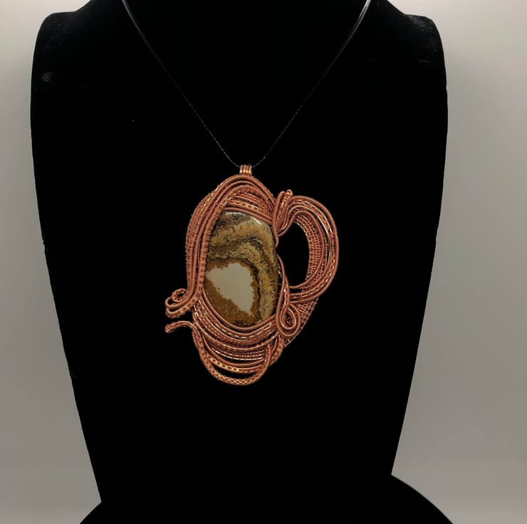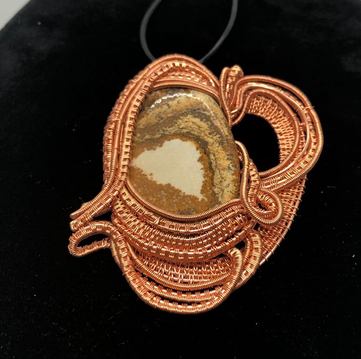 I have used a stunning African Jasper Cabochon as the centerpiece for this amazing pendant, and it displays a fabulous range of deep earth colours in a range of coiling striations. It is a truly beautiful Cabochon that reflects the Earth from which it came.