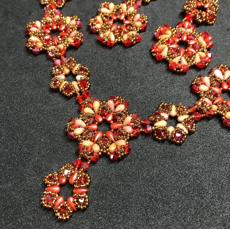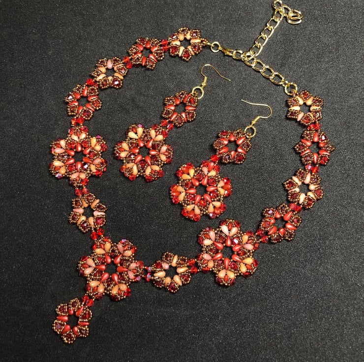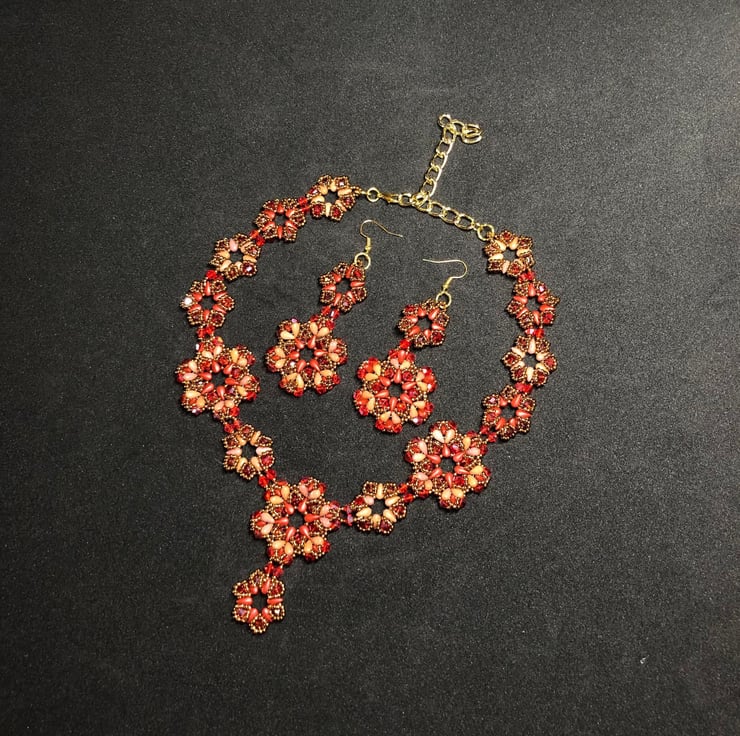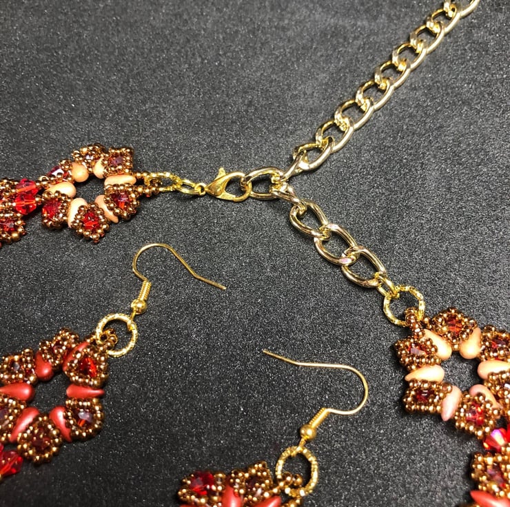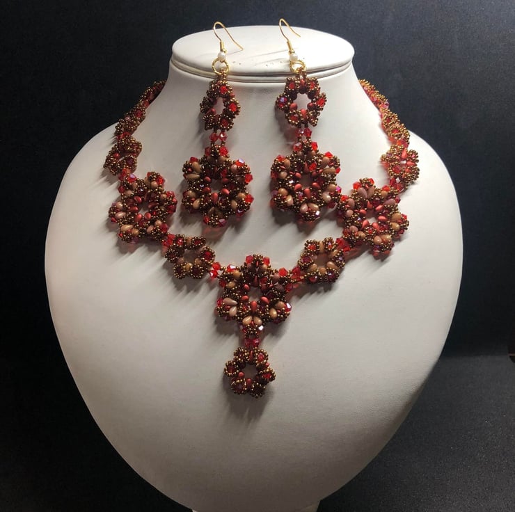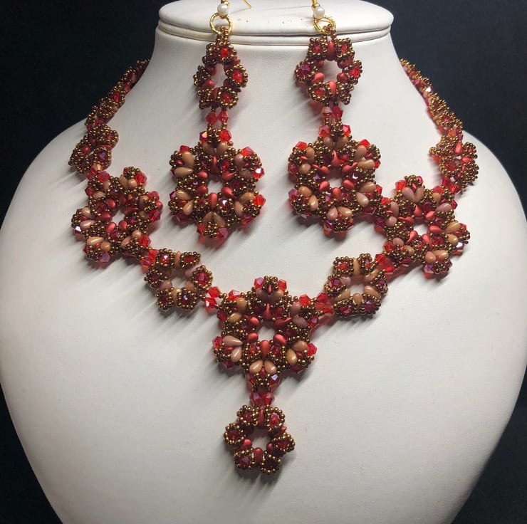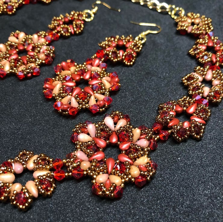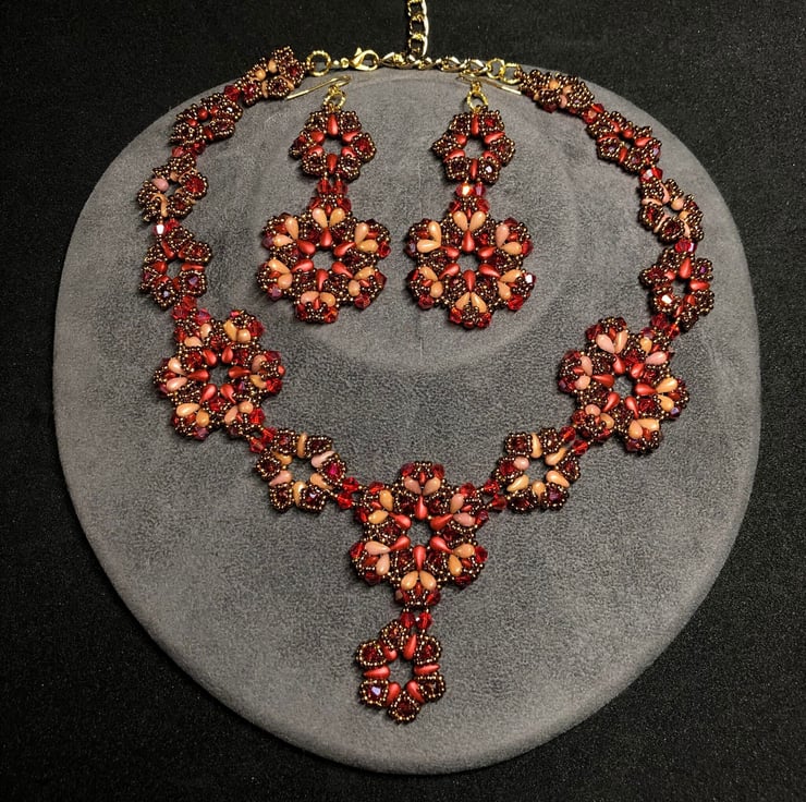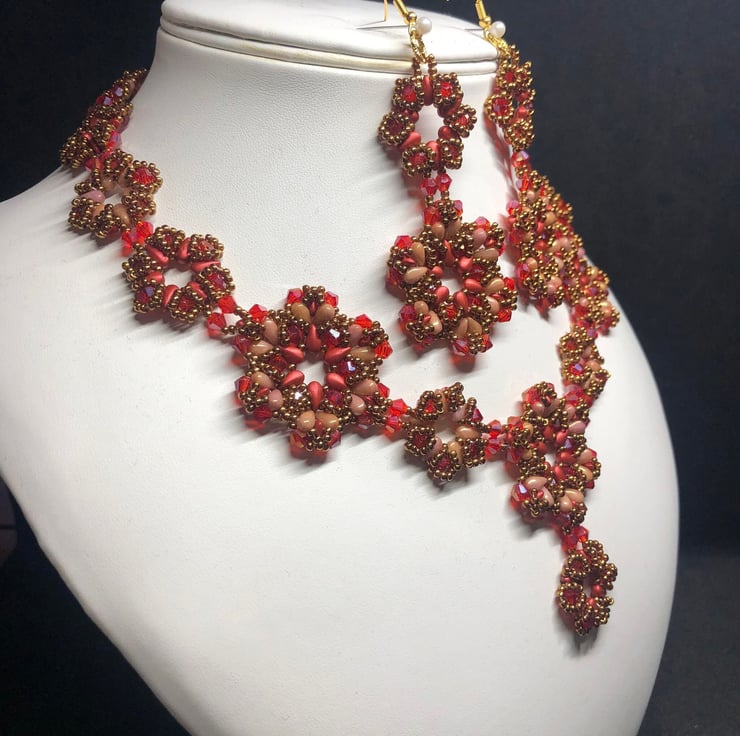 I used hundreds of bronze Miyuki glass seed beads, glass Dropduo beads and fabulous Aurora red crystals to build each component of this stunning set.