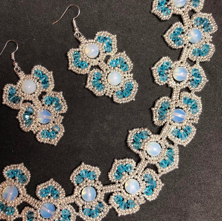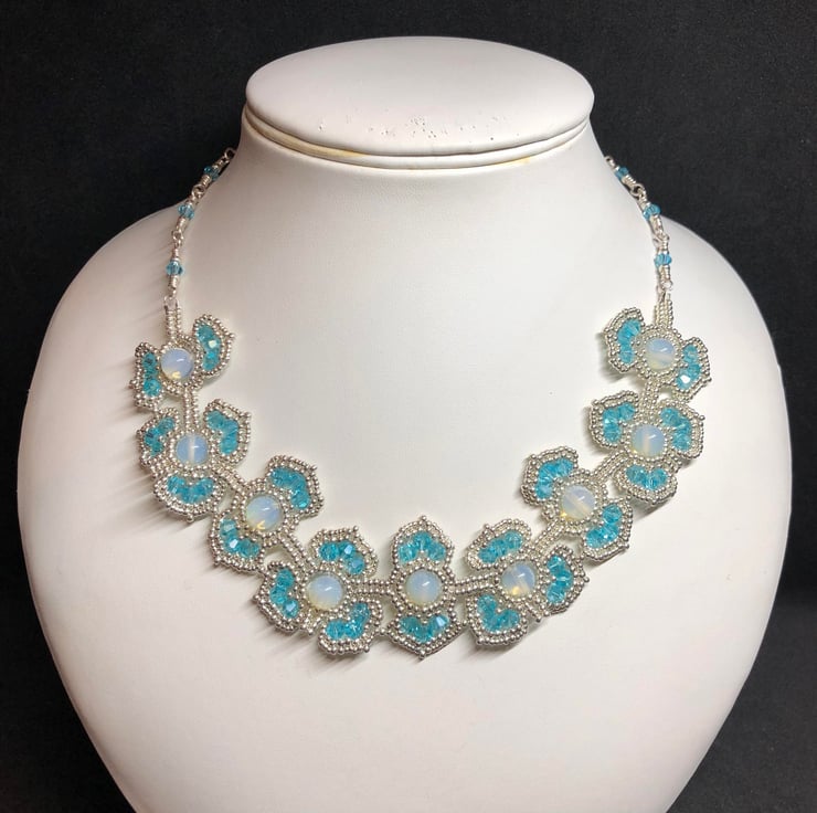 Beautiful Aqua crystals sparkle form a complicated seed bead pattern to form the most glorious swath of elegance around the neckline. The 18-inch necklace comes fitted with a silver-plated toggle clasp and looks simply breathtaking.