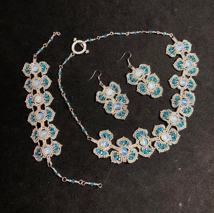 The matching bracelet repeats the two leak motifs around the wrist. I have used strong rosary links to complete the design with the benefit of the loops of each link providing flexibility with length.