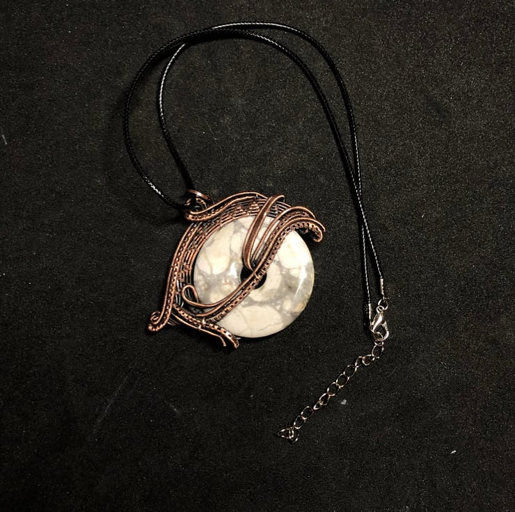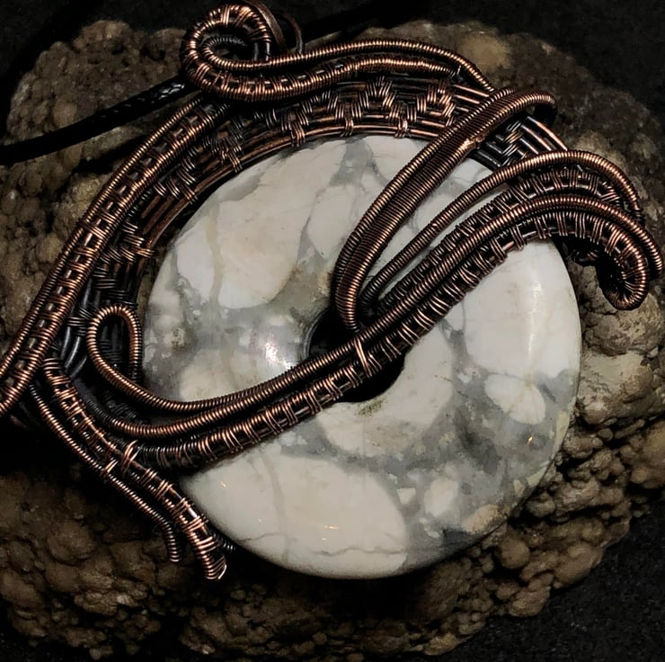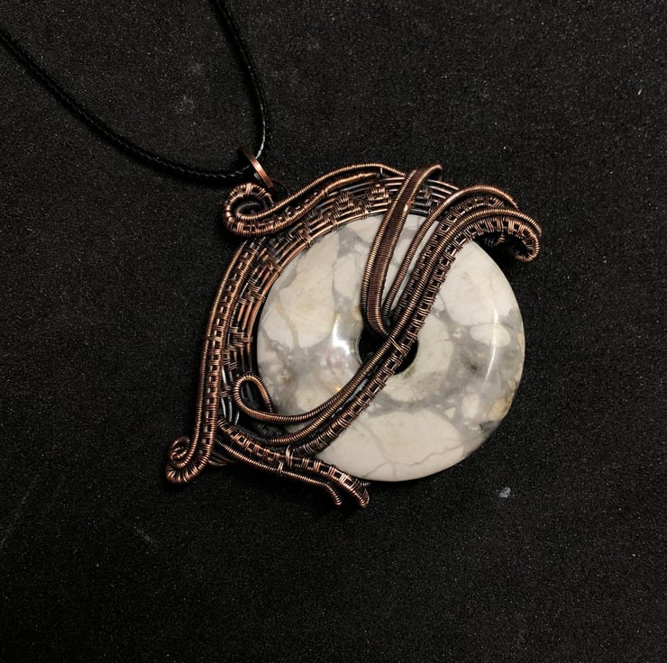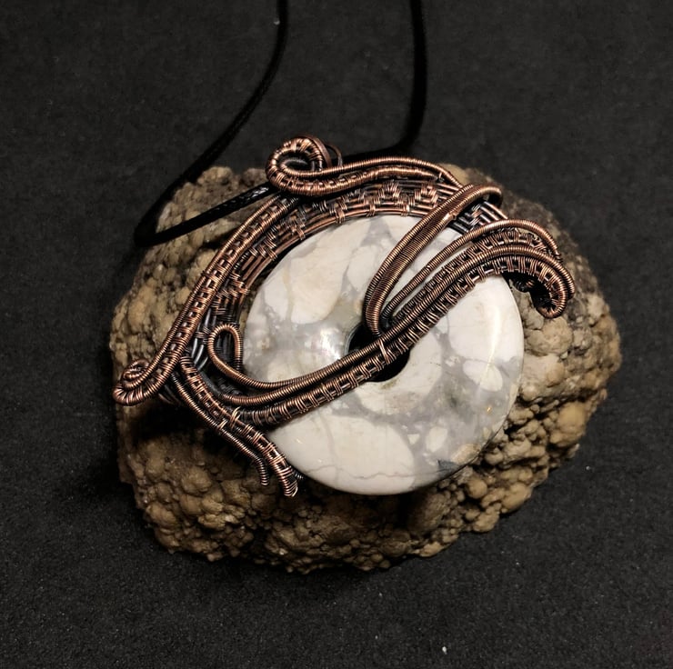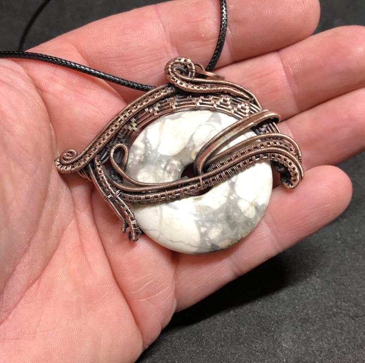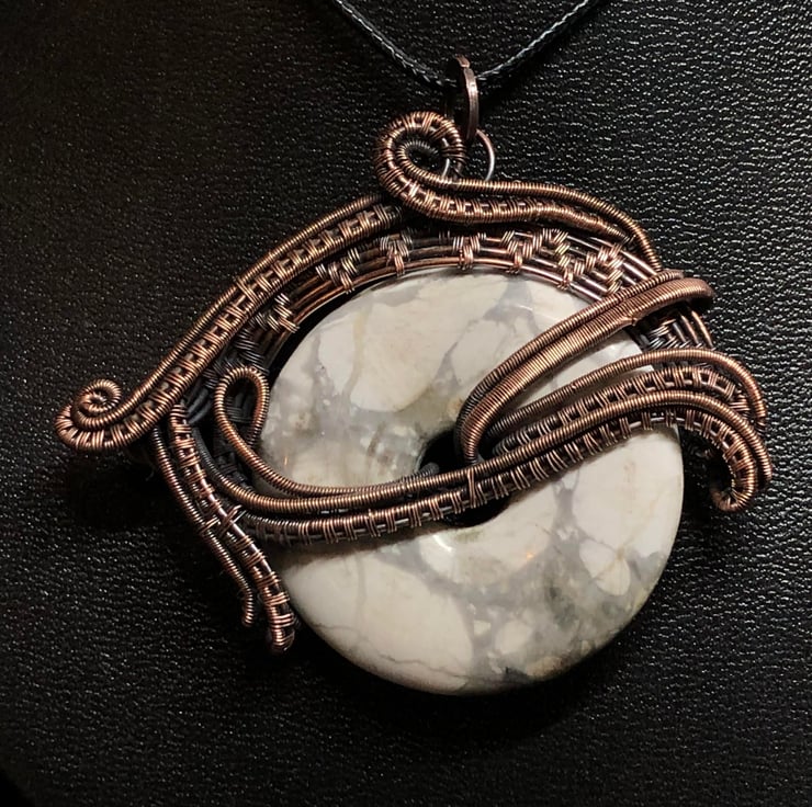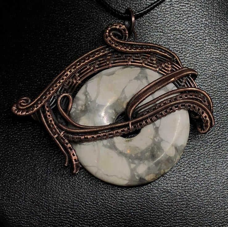 I have housed the donut in a complex wire-woven design made from copper. The design coils around the donut in waves of time, and you may turn the donut in its setting. I tarnished the copper before polishing it back to a deep luster which highlights the complex weave and brings the pendant to life. The pendant measures 7cm by 6cm and comes fitted on an 18-inch faux leather thong.