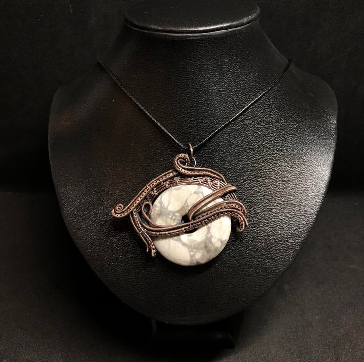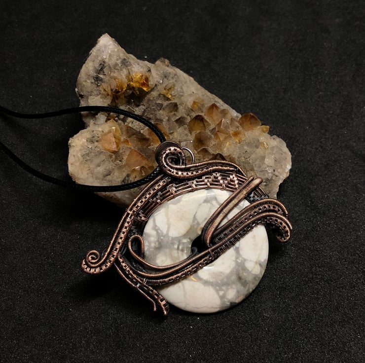 I have used a large natural Howlite GFemstone donut at the core of this complex pendant. Howlite is adored for bringing a sense of patience and calm to the wearer and enables the owner to slow down and move with ease through deep emotions and unrest.