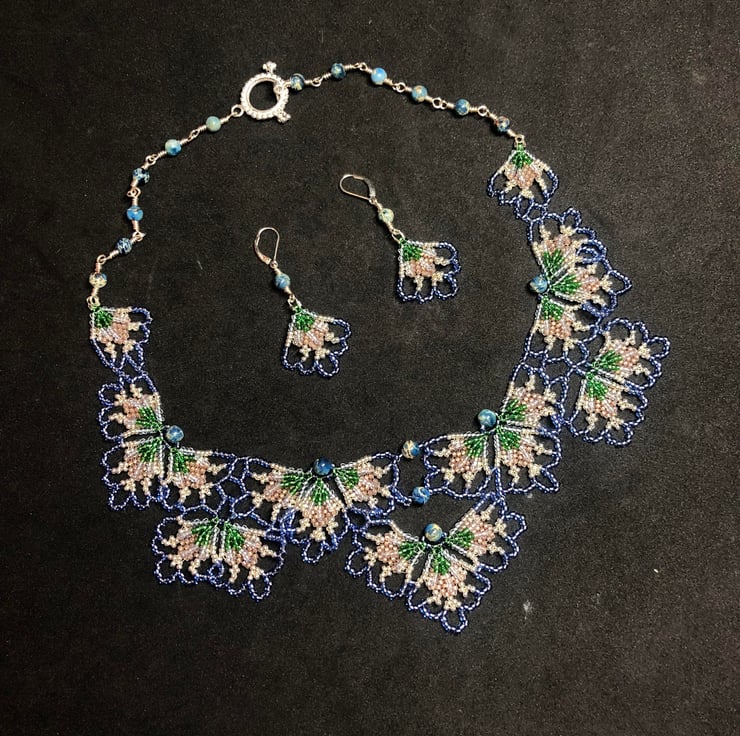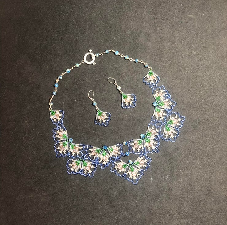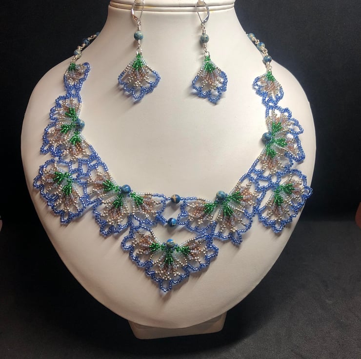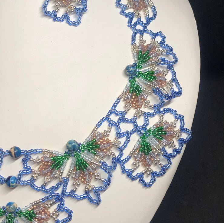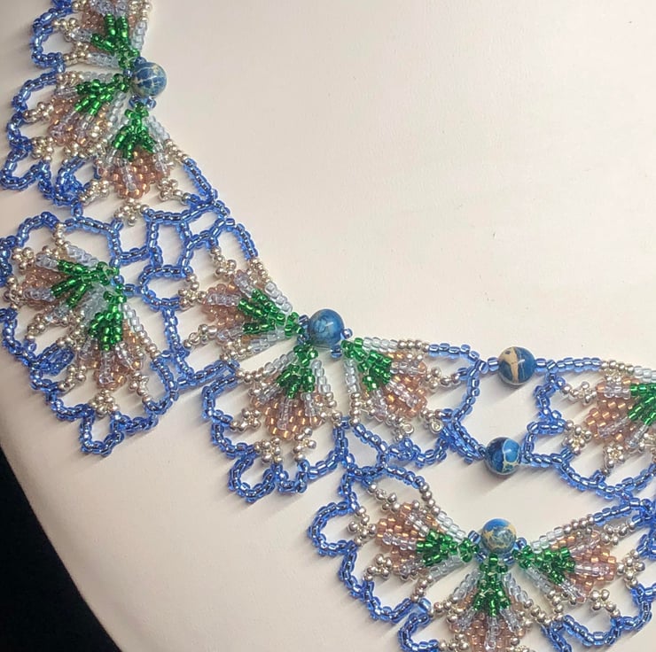 I used glass Miyuki seed beads to build the design, and each leaf is hand-sewn before constructing the necklace. Stunning Blue Jasper gemstones bring vibrant highlights to the swath of glass and knit the design together.