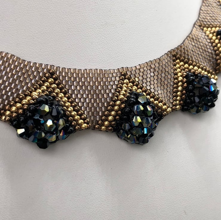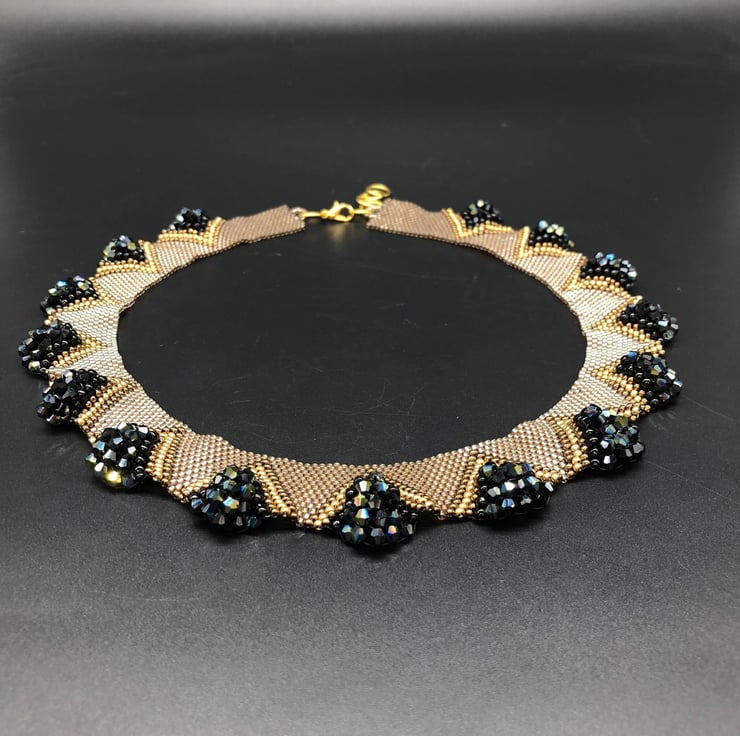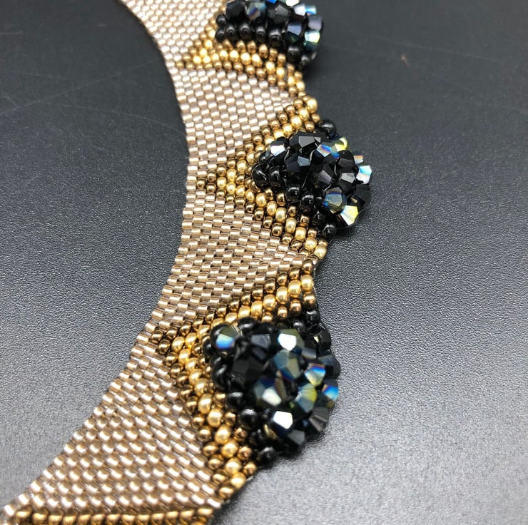 Arrakis dazzles. It's a three-dimensional collar with pyramids of stunning crystals that rise from the collar to surround the neck. It is made entirely from glass and crystal using 5 different types of glass Miyuki seed beads and fabulous black aurora bicone crystals. By hand-sewing using a precise technique, the collar naturally curves around the neck, but the stitching allows the crystals and larger seed beads to form beautiful pyramids.