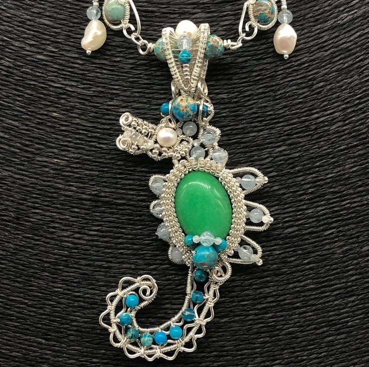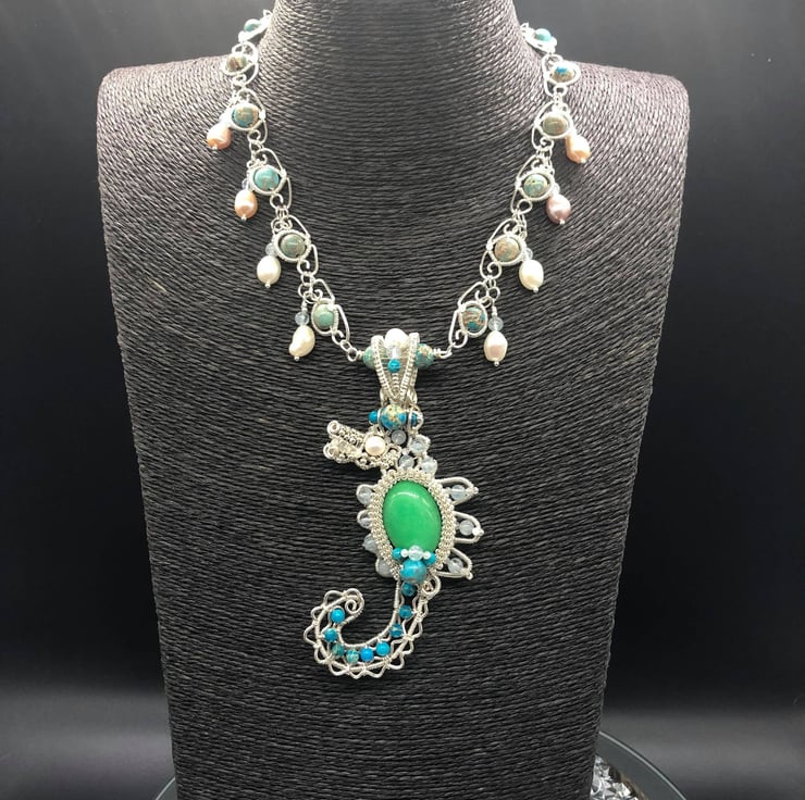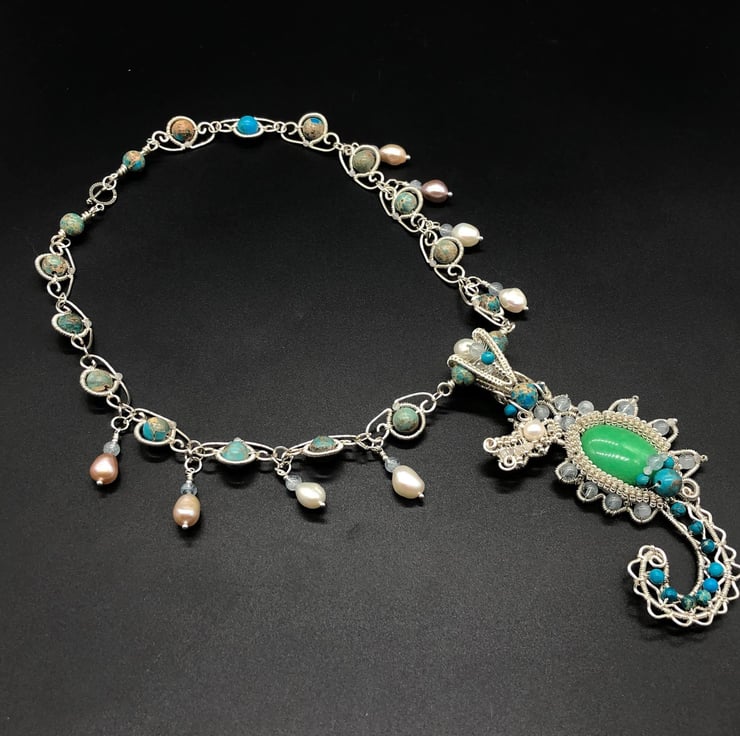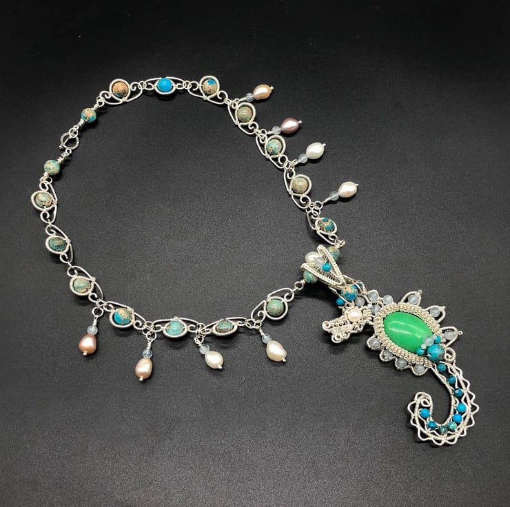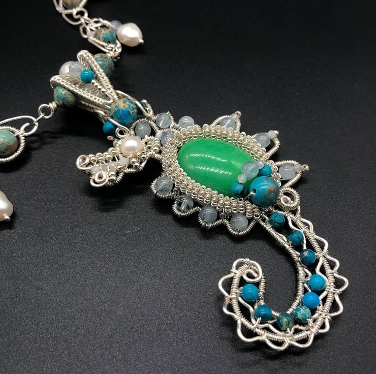 Seahorse Wire Weave necklace with Aquamarine, Jasper, Moonstone and Freshwater P