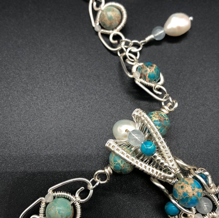 The neckline took almost as long to make, with each individual link wire wrapped to contain Blue Jasper and Moonstone. I used Aquamarine and Freshwater Pearls to make the drops that dangle so delicately from the neckline. The necklace comes finished with a toggle clasp. The overall m