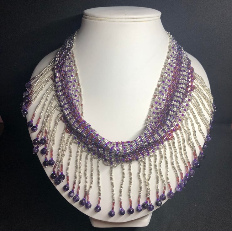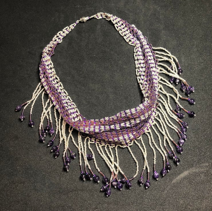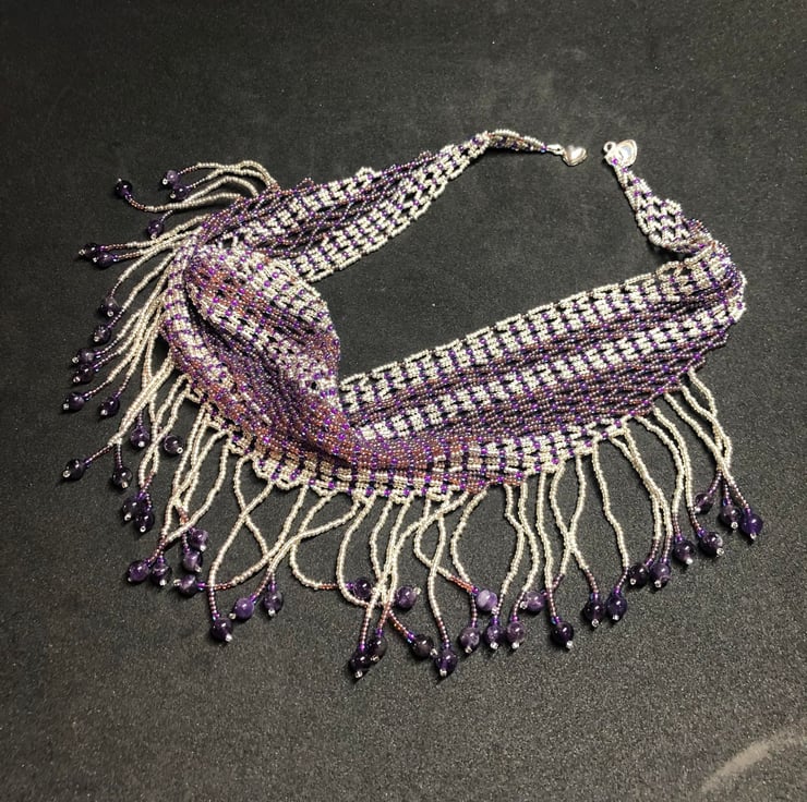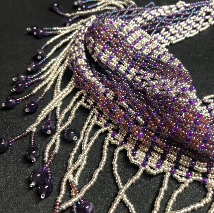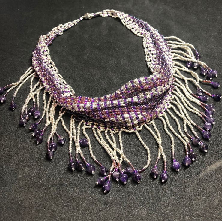 The piece comes fitted with a heart-shaped magnetic clasp for ease of wear so it forms a wonderful drape down and across your neckline. It's just like a beautiful silk scarf, except it's a necklace, and it's made from glass seed beads! The fringing along the bottom edge brings the design to life, and each strand ends with a stunning, deep Purple Amethyst gemstone.