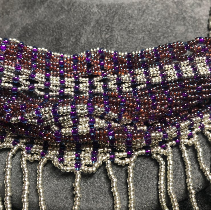 This is basically a large triangle of fabric made entirely from seed beads. The complex weave builds up gradually over time, and I have used various shades of Silver and Purple to create a gorgeous band running across the length of the fabric. However, it is entirely made from glass! Tiny glass seed beads. And it is so soft, and it drapes like fabric.