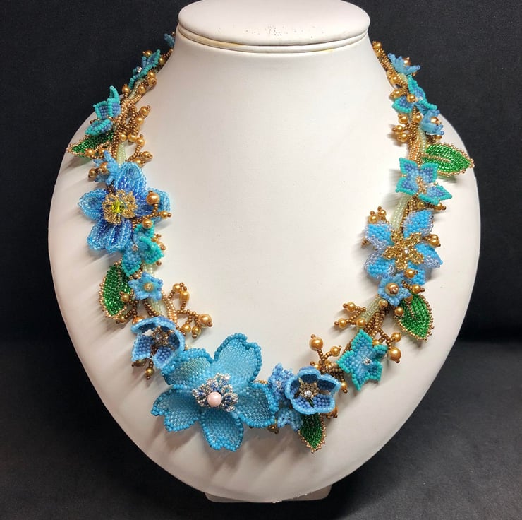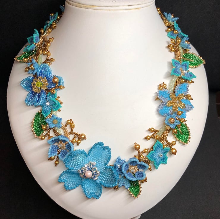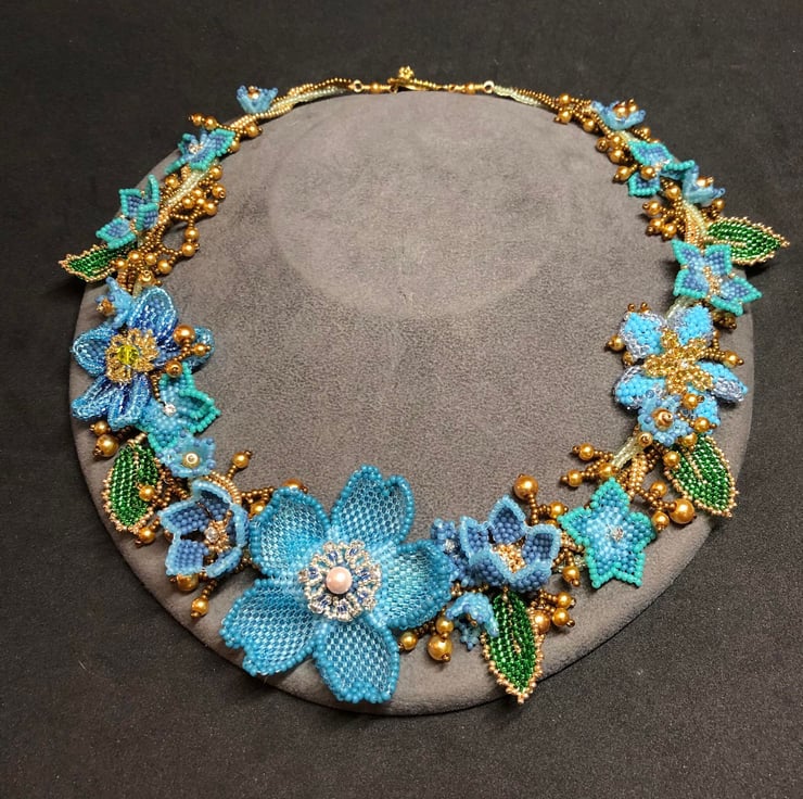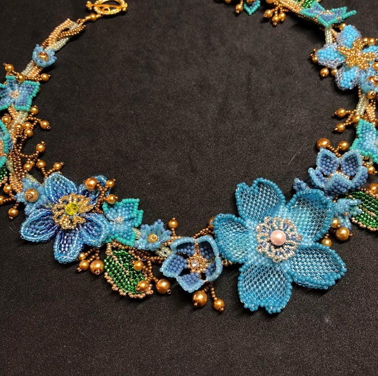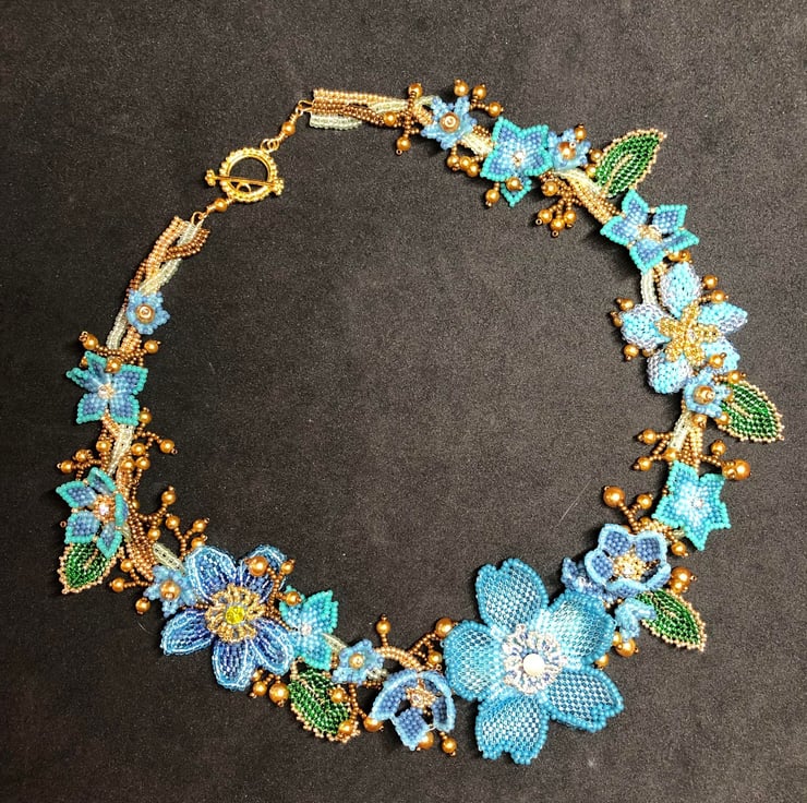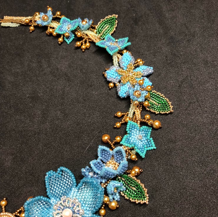I used Miyuki glass seed beads to make each flower in a variety of blue tones, and the colours really pop against the neckline. The flowers and vibrant leaves cover a triple herringbone rope that drapes elegantly around the neckline.