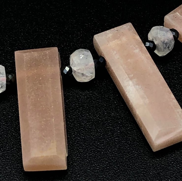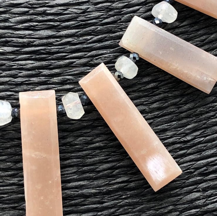 To further enhance the necklace and allow light inside both the Peach and Rainbow Moonstones, I have used tiny Black Spinel gems. Spinel has a higher light refraction than Diamond, and sparkles with fiery life, making it the perfect accompaniment to the Moonstone.