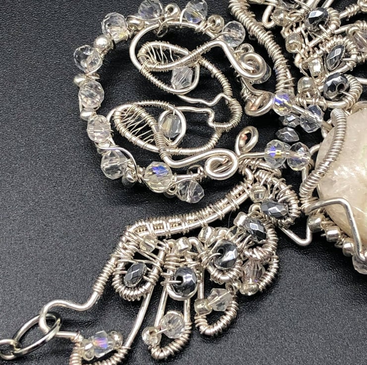 I used tarnish-resistant silver-plated copper wire to weave this intricate Guardian Angel. The body is full of detail, and I have packed it with Aurora crystals and Hematite. She sparkles at every turn but embraces you with love and protection. The Angel measures 3.5 inches by 3 inches.