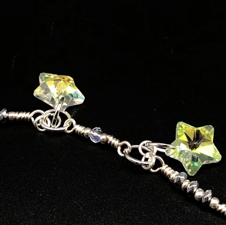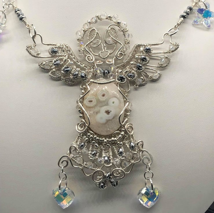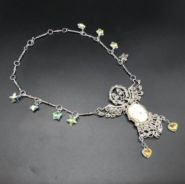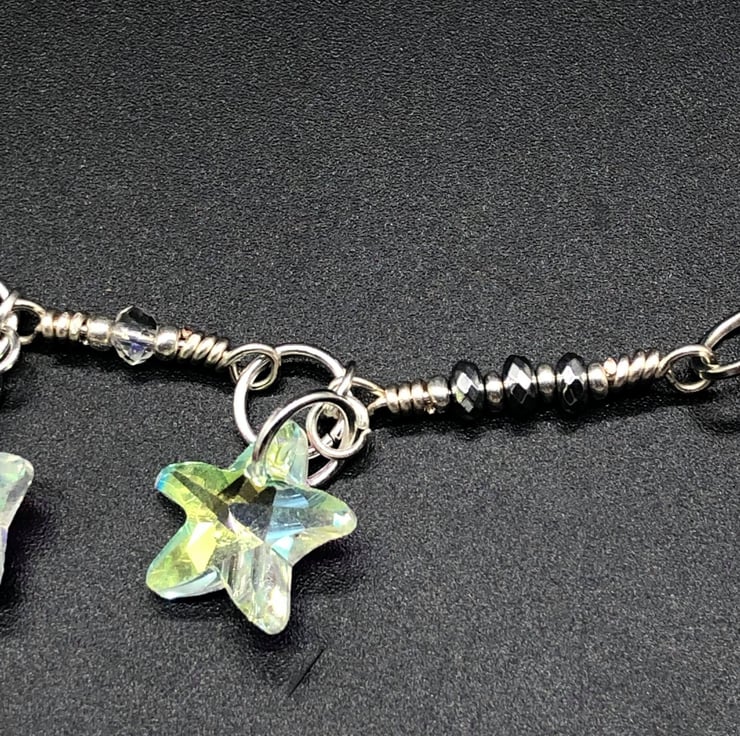 The 18-inch neckline is completed using Aurora Quartz and Hematite in handmade rosary links finished with a toggle clasp. I have hung the most stunning Swarovski Crystal stars from the chain and two beautiful Swarovski crystals from the Angel.
