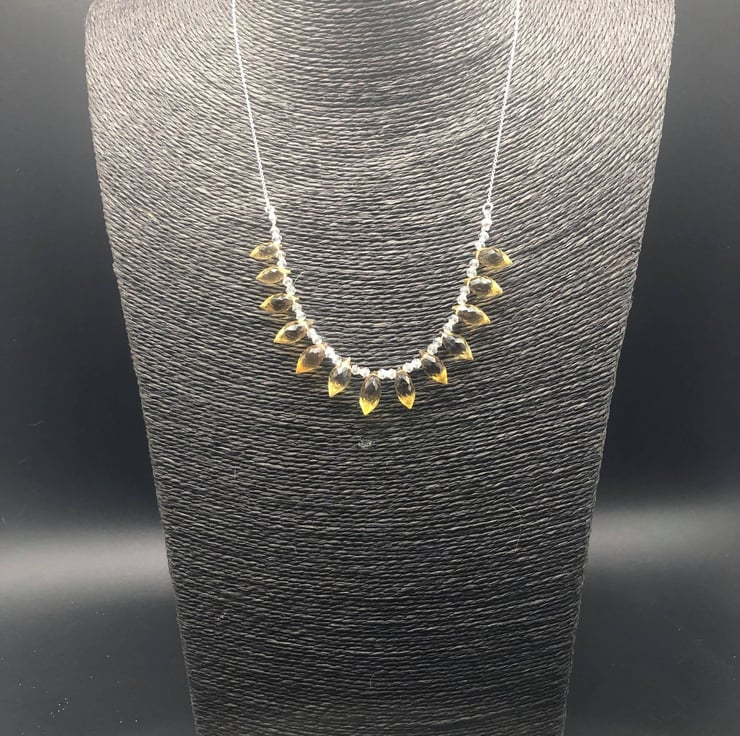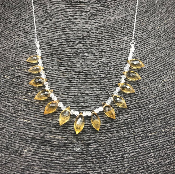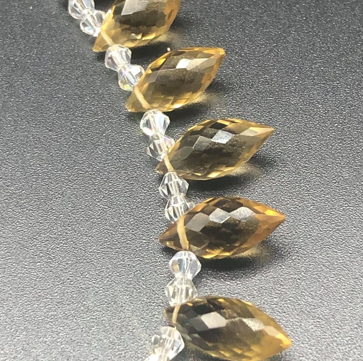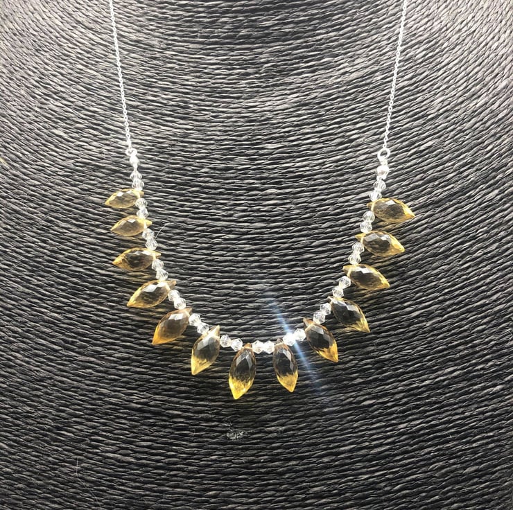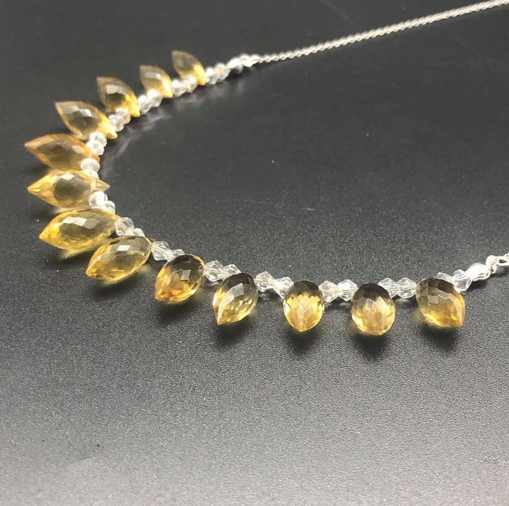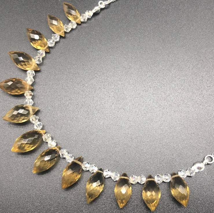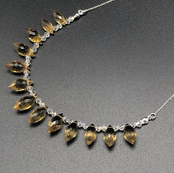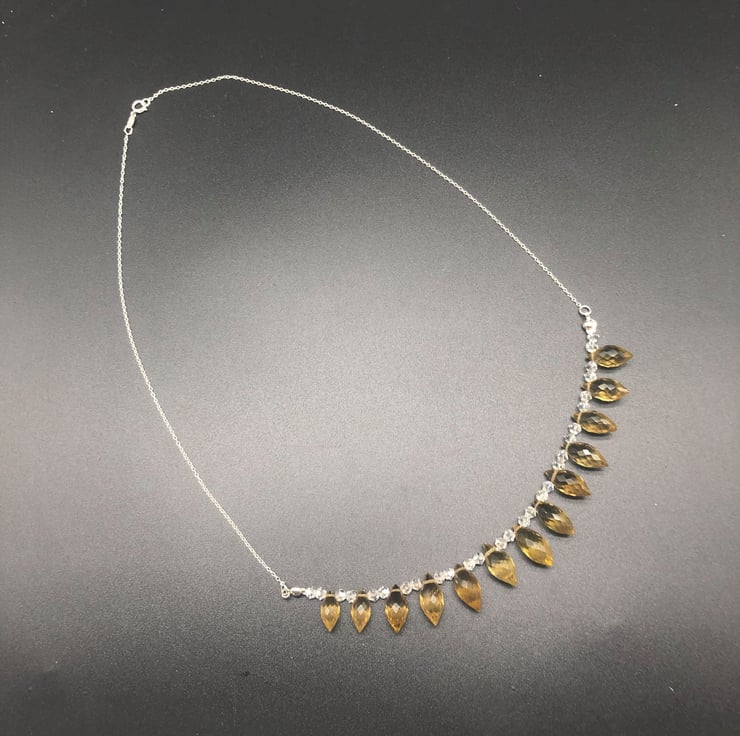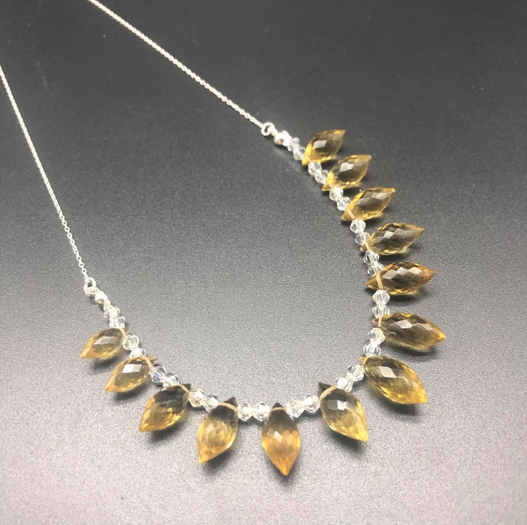 This handmade, 925 Sterling Silver necklace uses a very rare form of natural Champagne Quartz gemstones. Each stunning gemstone is faceted to absolute perfection in a dazzling droplet of utter beauty. The necklace forms a part of my Signature Collection.