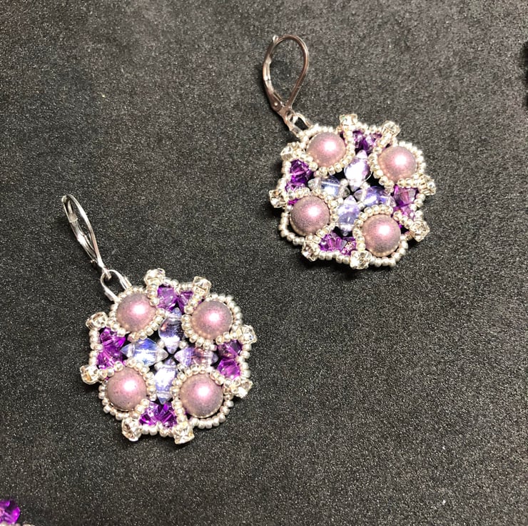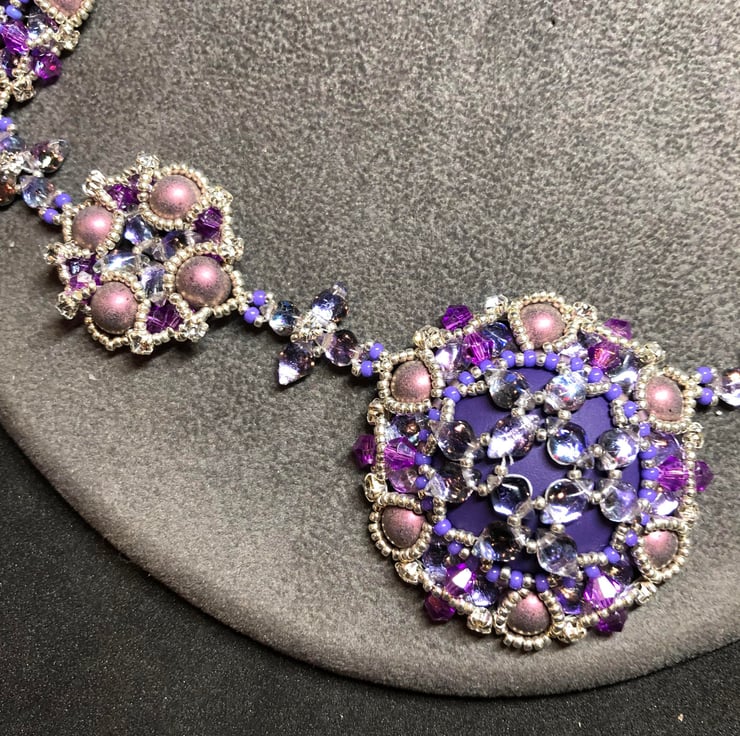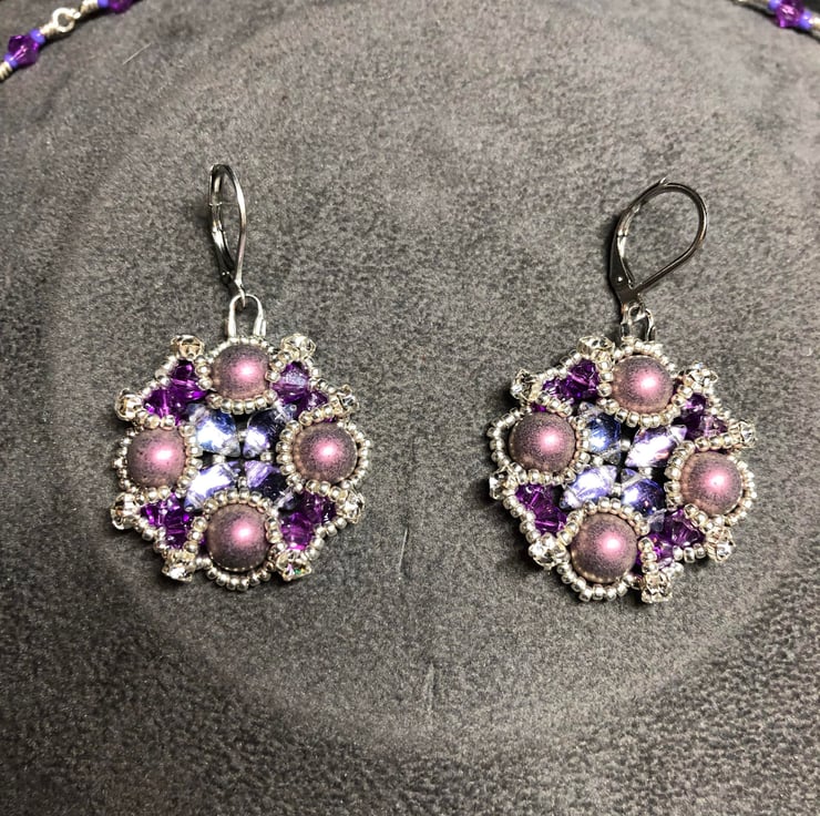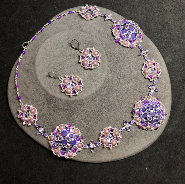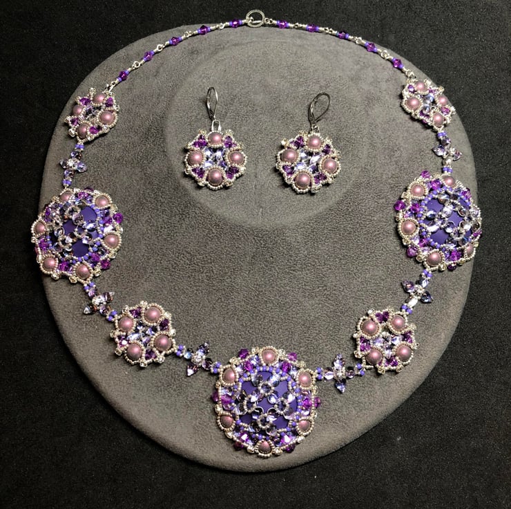 I used glass diamonduo beads, Miyuki glass seed beads, Purple crystals and fabulous clear sew-on crystal settings to embellish and build the design. The result is an intricate showstopper of a set that is both luxurious to look at and sparkly to behold!