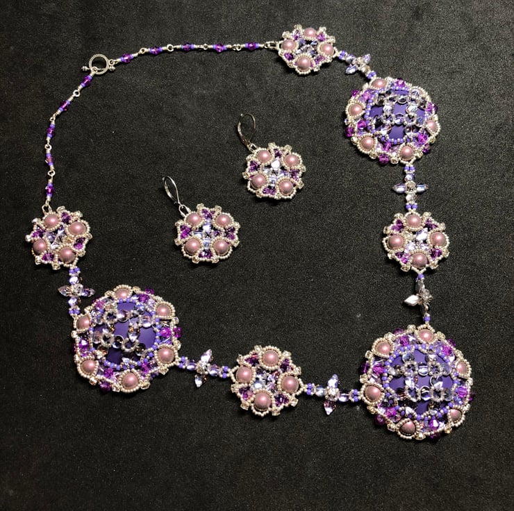 This is a very complex set which took a week to make. Vibrant purple glass cabochons form the basis for each of the larger components, and the various tones of purple used throughout the set really glow and shimmer.