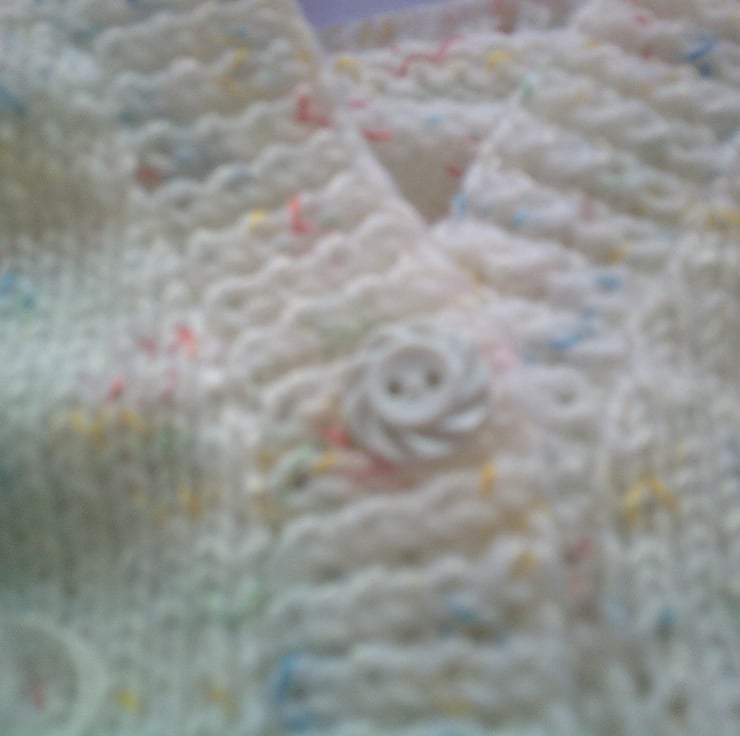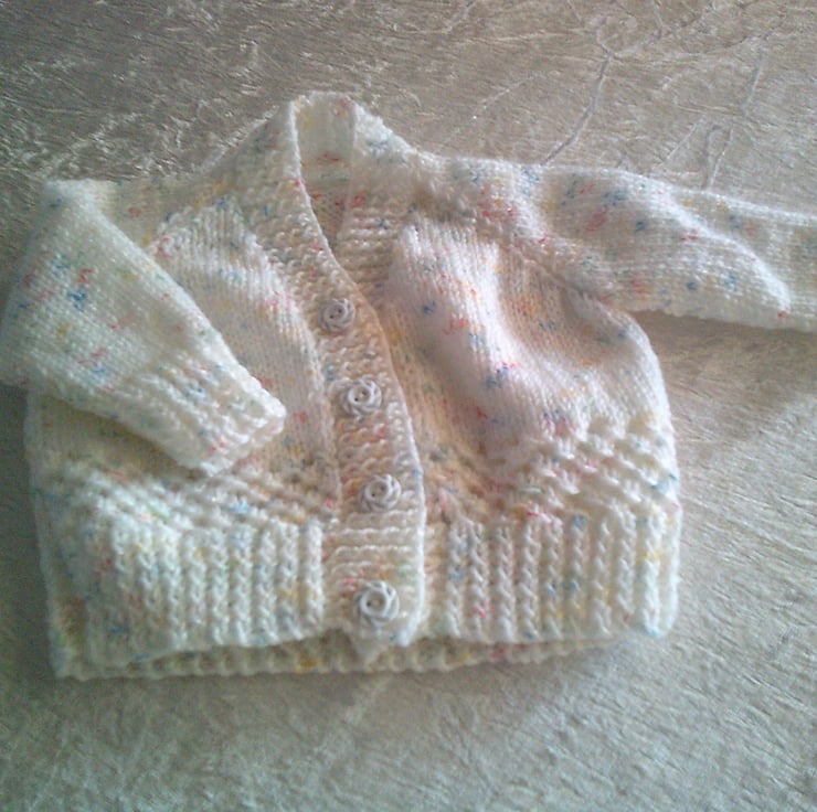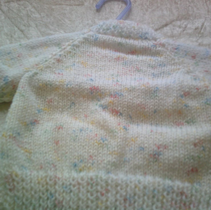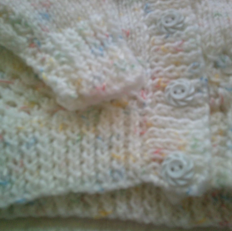 This hand knitted White V Neck cardigan is made using acrylic yarn and a lacy design at the bottom of the fronts and raglan sleeves along with red, blue, green and lemon threads running through it, and would make a lovely addition to a babies wardrobe.