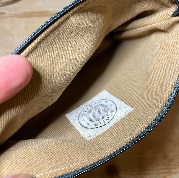 The pouch if fully lined with soft tan twill from a sample swatch leftover at the end of the season in the fashion industry. The zip pull has a strip of leather attached.