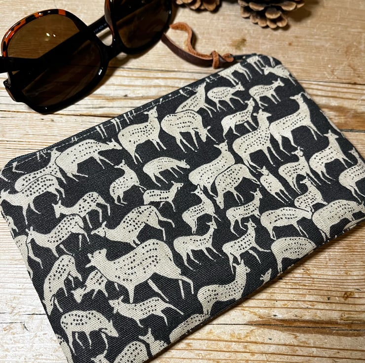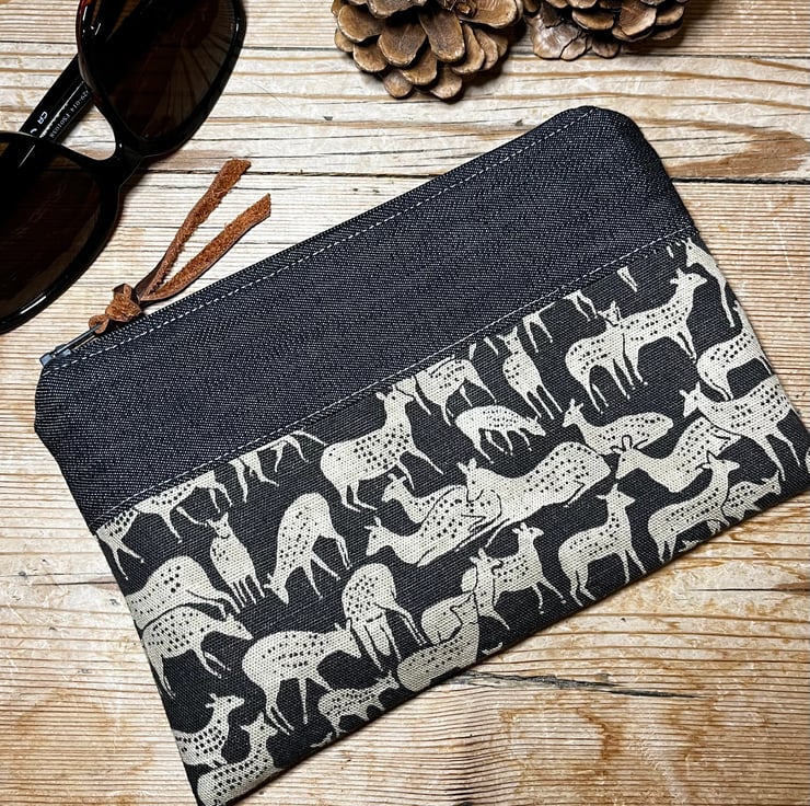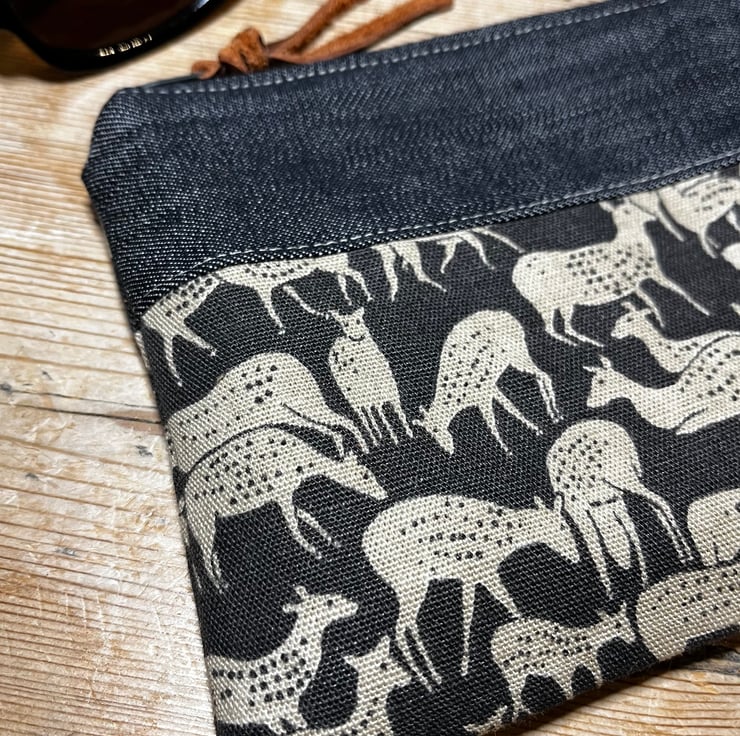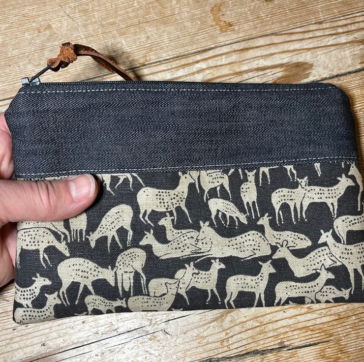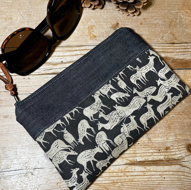 One of a kind zip pouch made from Schumacher Fauna linen blend fabric with a pattern of grazing deer on a charcoal background. It has a contrasting band of lightweight dark denim.