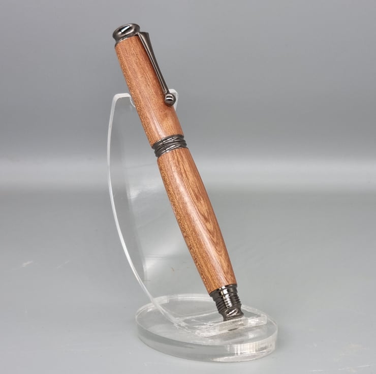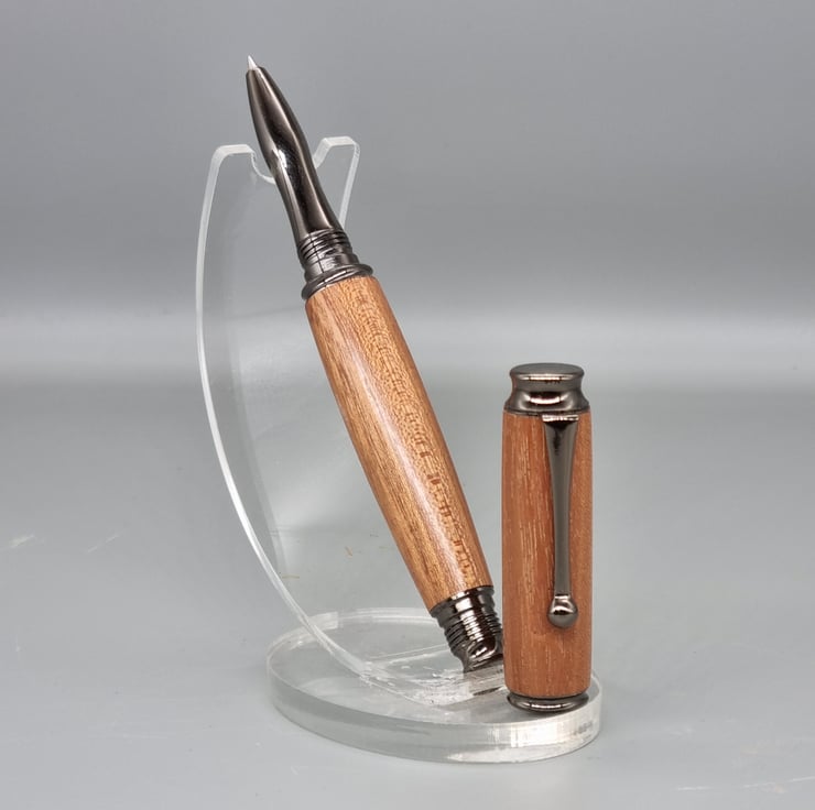 This gun metal fitted mahogany pen is a delight to write with. The pen parts were designed in thr UK and the wooden parts turned on my lathe using traditional and modern techniques.