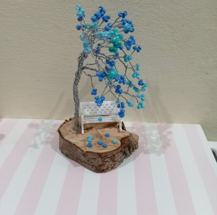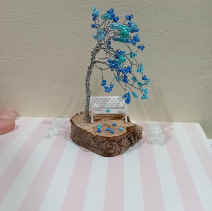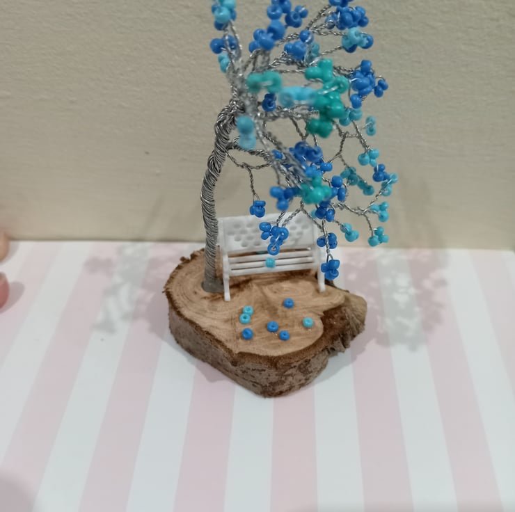 I loved creating a scene. Added some blue beads as if the wind blew the flowers off the tree. It reminds me of the bench in my favourite walk next to a lake.