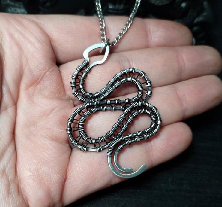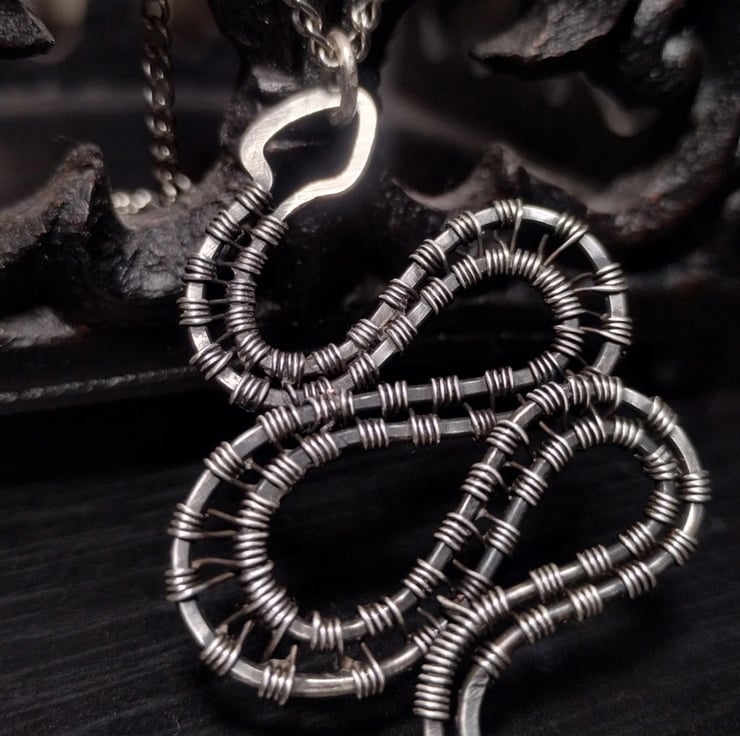 Handmade wirewrapped aged silver snake pendant. This pendant is made out of silver-clad copper which, unlike silver-plated copper, is more durable and resistant to discolouration. Finished with jeweller's wax to prevent tarnish. The pendant hangs on an 18 inch long silver tone chain necklace with a lobster clasp.