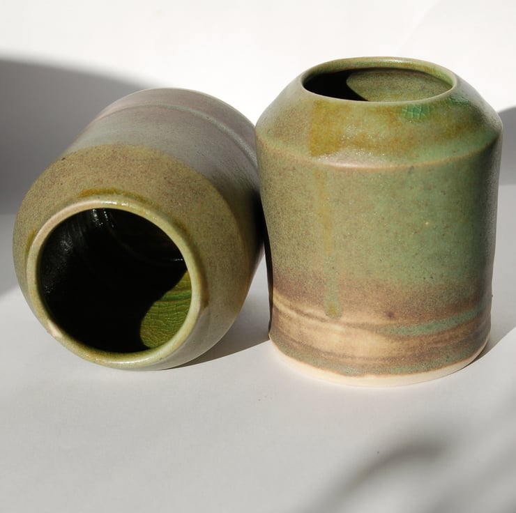 Modern shaped rustic vase. The matt glaze is applied to vary slightly in thickness so that it shows variations of colour and surface texture.The colour is on trend olive green.
