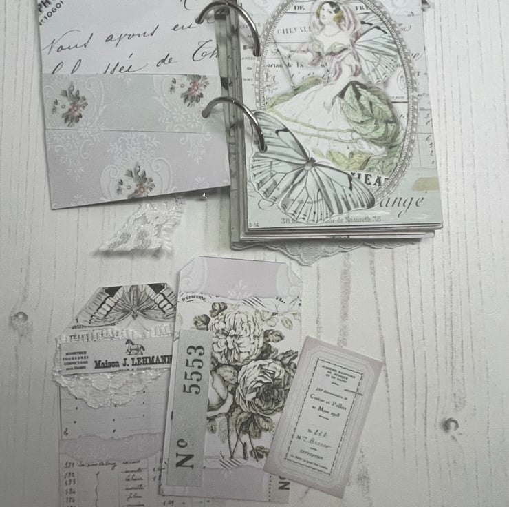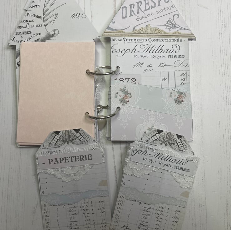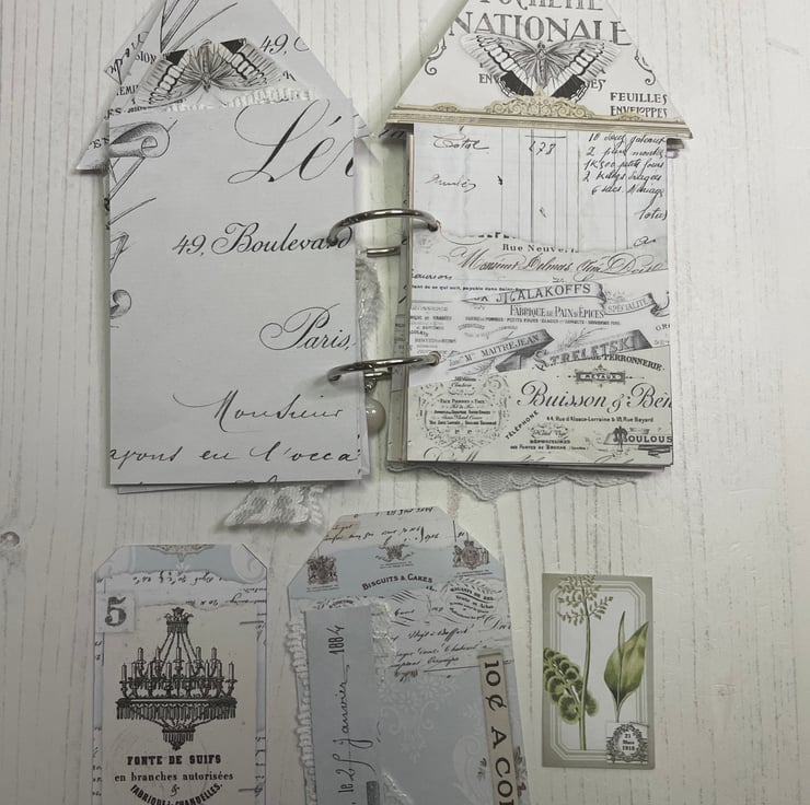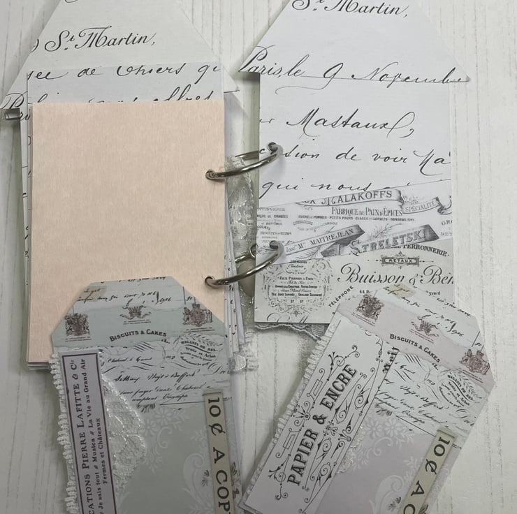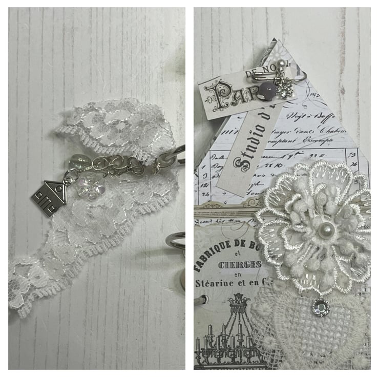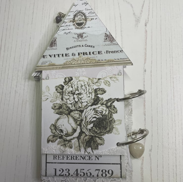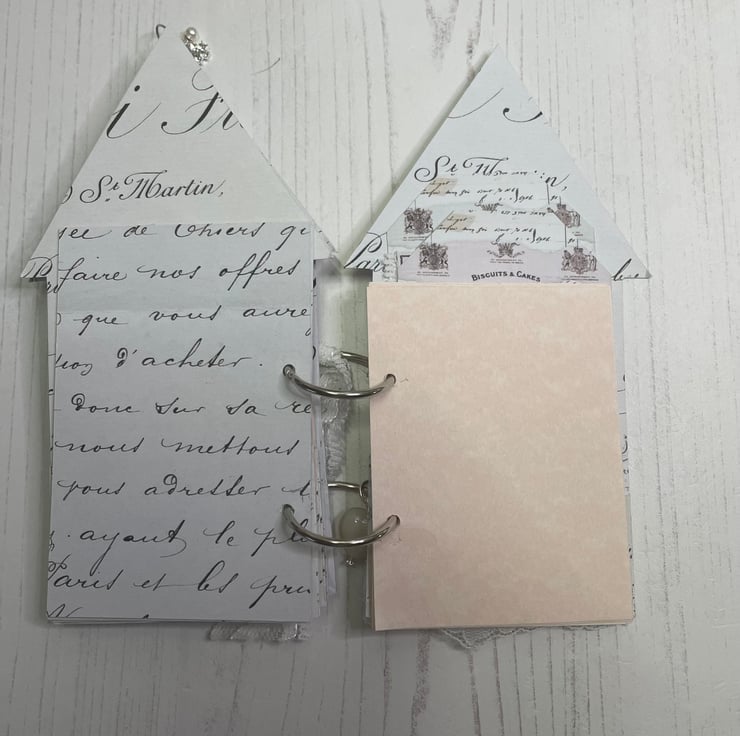 Mini journal in the shape of a house. In muted blues and pink. Measures 3” x 6.25” excluding ring bindings. Front is decorated with lace flower and a heart with a diamanté detail. Lace to one of the rings with a house charm on a chain with beads. Heart bead on the bottom ring. Bulb pin at the apex of the roof holds word cards with a bead and mini charm. 4 house pages with 2 cards and 2 frames. Pink mottled paper in 2 sections for writing 9 pages each. 6 pockets and 9 tags.