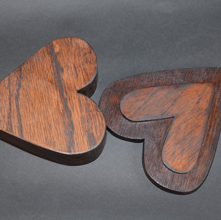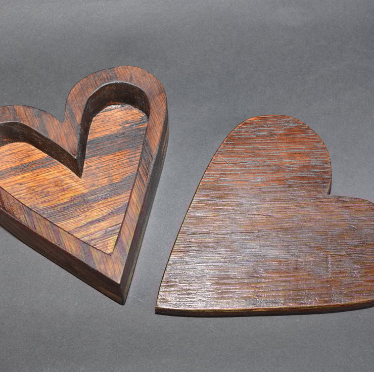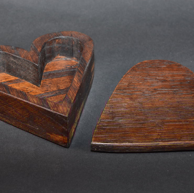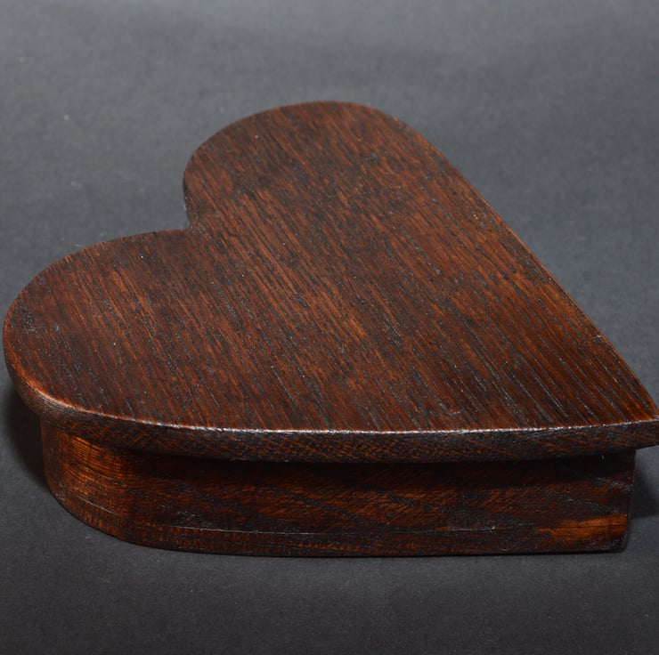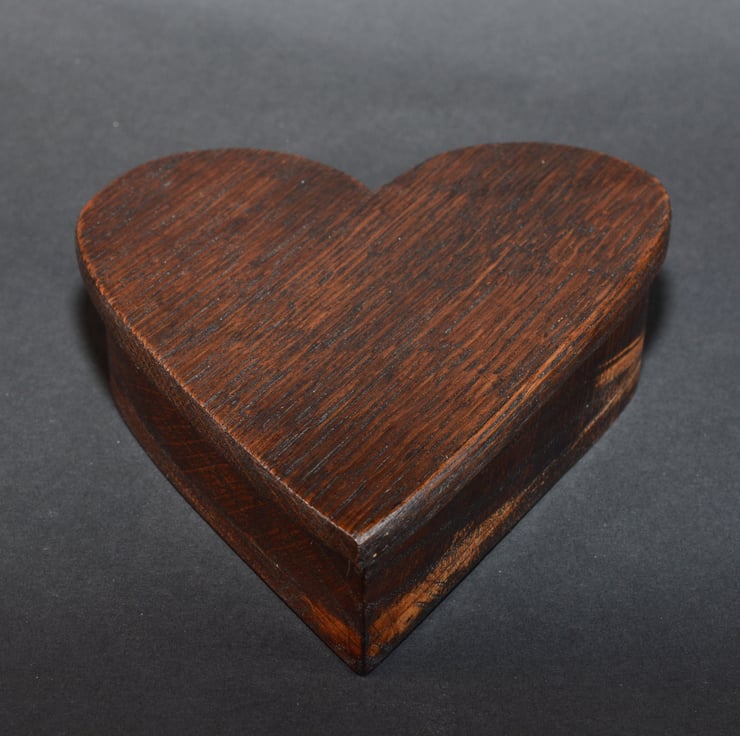 Hand made from solid antique salvaged English oak. Heart of oak love token box. 12.5cms tall, 11.8cms wide and 3.8cms tall.