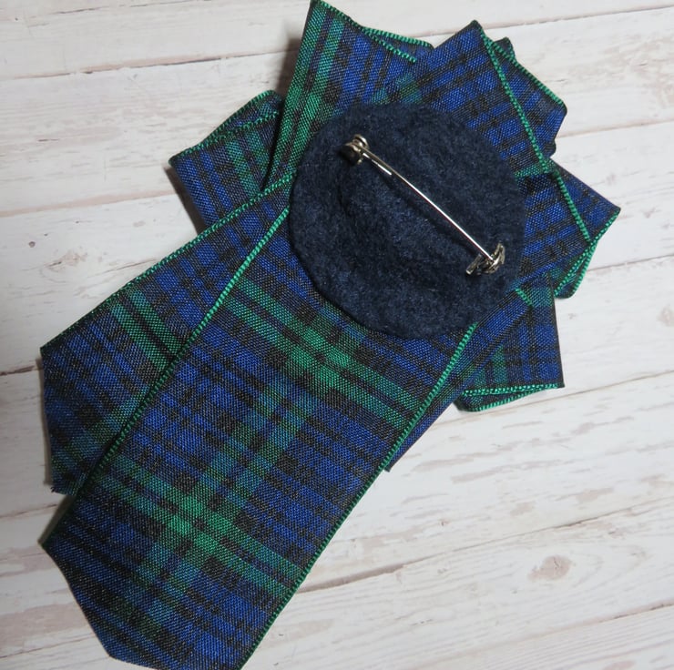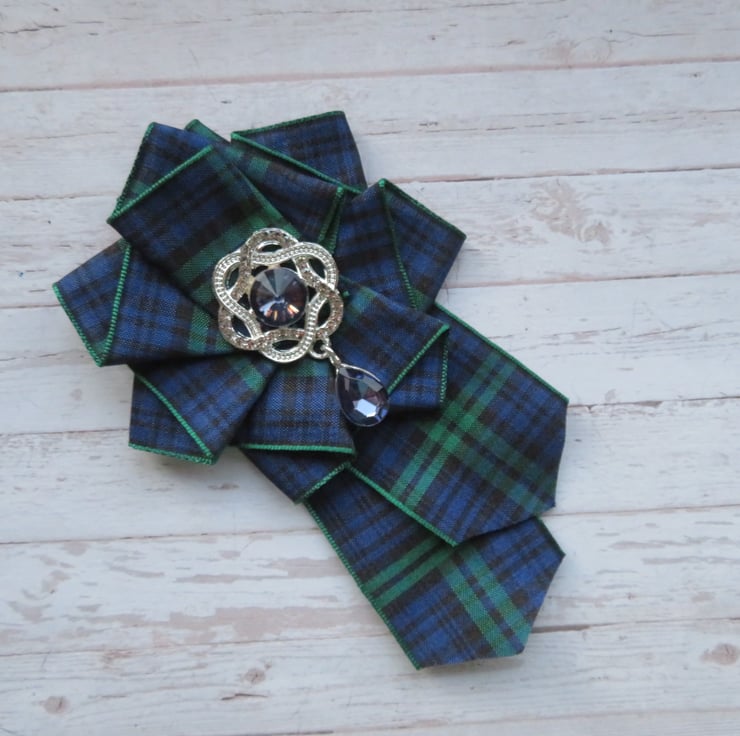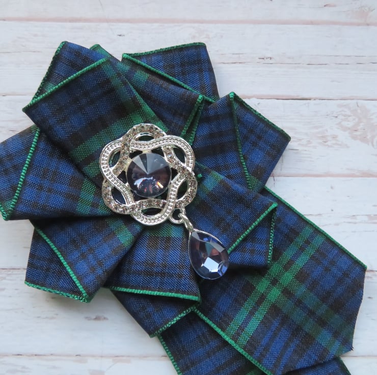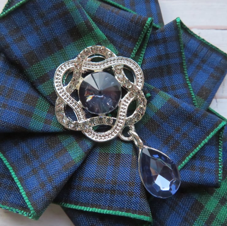 Made with a handmade and sewn ruffle of wide 40 mm Black Watch tartan ribbon with wide ribbon shaped trails and finished with a silver diamante swirl shaped jewel piece with a light navy stone and drop.