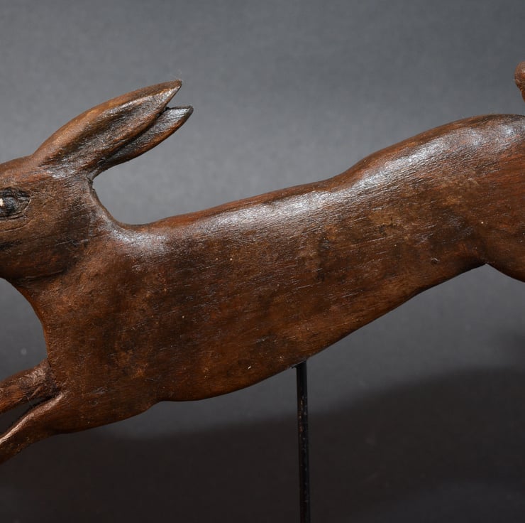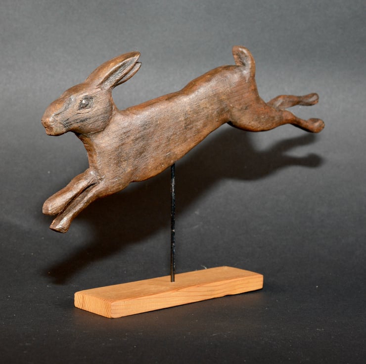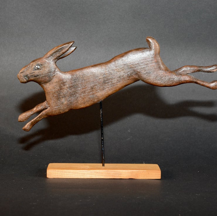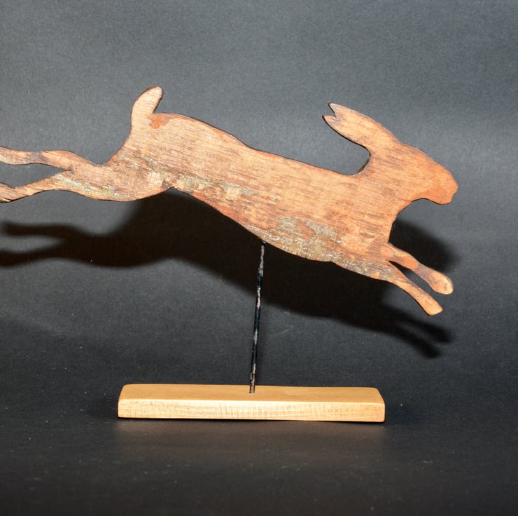 A charming mystical leaping hare sculpture. Hand carved by Jane from salvaged antique wood mounted on a recycled bicycle wheel spoke and salvage pine base. 18cms long, 12.5cms tall and 2.8cms deep.