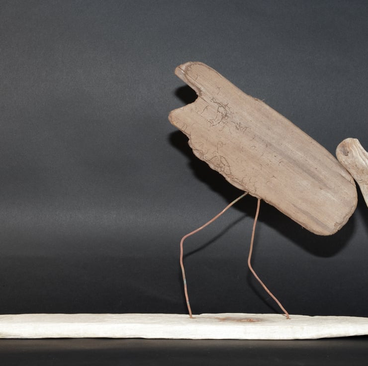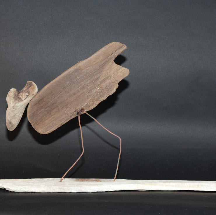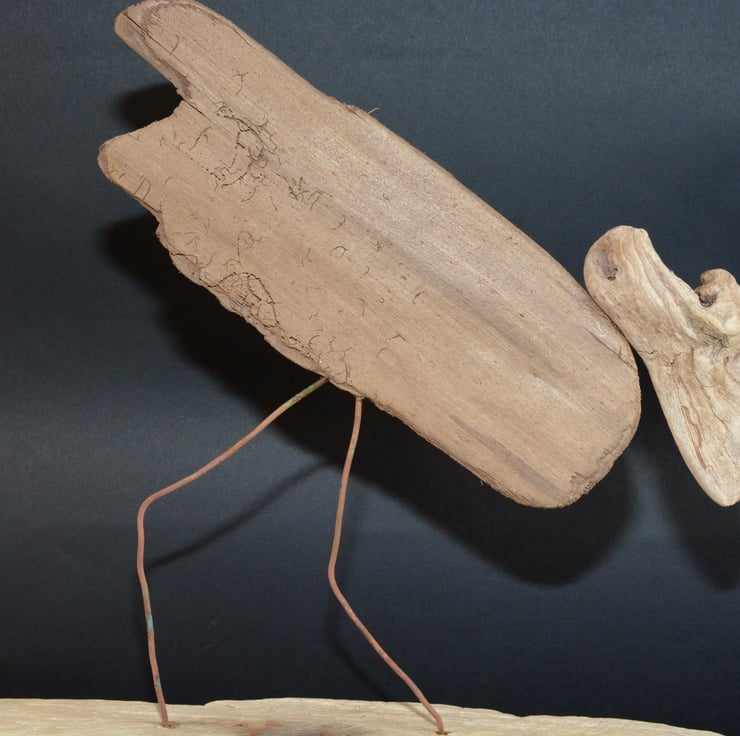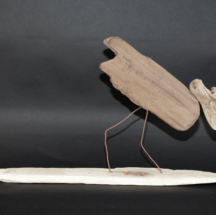 A dritwood sculpture "feeding shorebird". Hand made from driftwood elements found by us whilst beachcombing and beach found copper wire. Created by the ocean, assembled by us. 26cms tall, 46.5cms long and 8cms deep.
