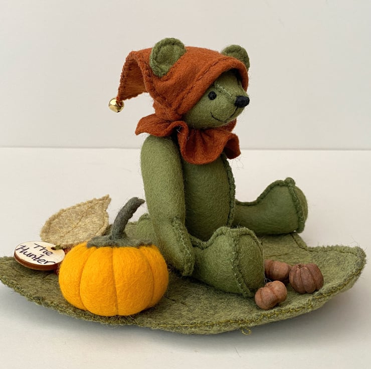 The Hunter is approx 6.5" tall and one of the woodland elves from my Signature range of bears. The signature range are hand sewn to the right side of the fabric with 3 rows of stitching for strength and stability and all feature hand embroidery, The Hunter has been embroidered to one side of his body front in lovely Autumn colours, sunny mustards and oranges.He has been sewn from 100% wool felt in moss green and is fully jointed with cotter pin fitments making him a poseable bear.