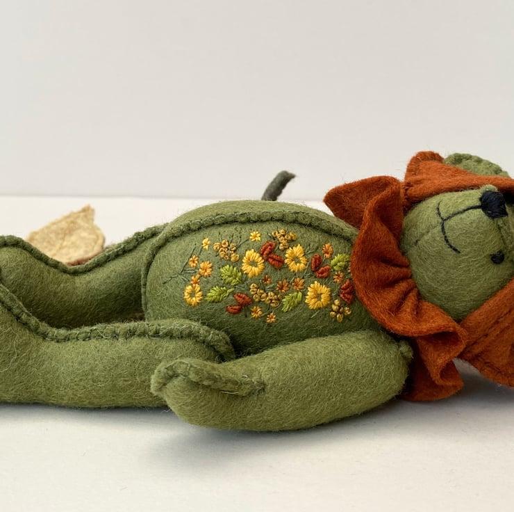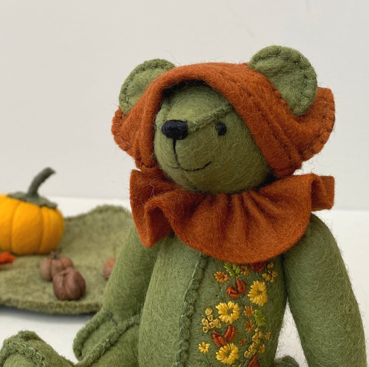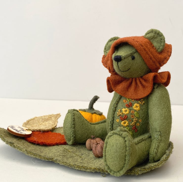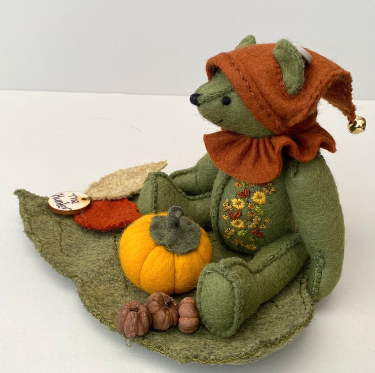 The Hunter is approx 6.5" tall and one of the woodland elves from my Signature range of bears. The signature range are hand sewn to the right side of the fabric with 3 rows of stitching for strength and stability and all feature hand embroidery, The Hunter has been embroidered to one side of his body front in lovely Autumn colours, sunny mustards and oranges.He has been sewn from 100% wool felt in moss green and is fully jointed with cotter pin fitments making him a poseable bear.