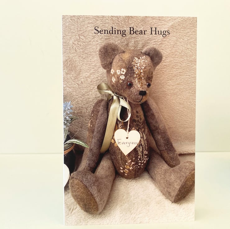 This listing is for Evergreen Bear a beautiful hand embroidered and hand dyed green alpaca fabric bear. Sending Bear hugs is printed to the front of of card and this is the one used in my new letterbox bears gift boxes. Are you thinking of someone, do you miss someone or just want to send a line, this card would be ideal to let someone know that you care.