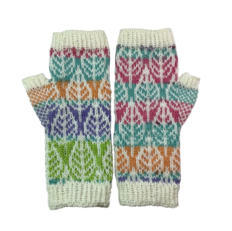 The main yarn is 75% wool and 25% nylon and is a clever print that when knitted up produces stripes of colour ranging from lavender, orange, turquoise, lime green and cerise pink. I have used a plain cream for the background that shows the stranded pattern off beautifully.