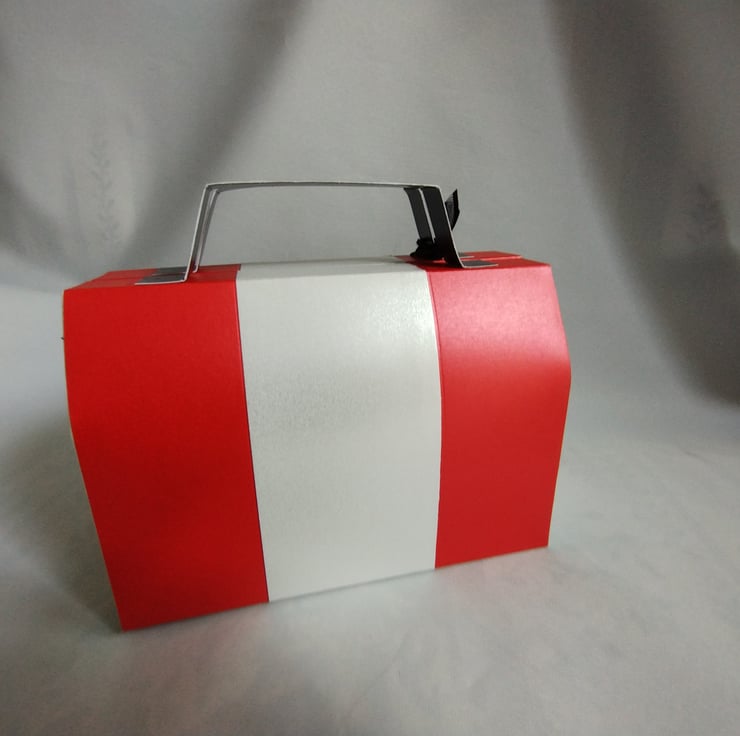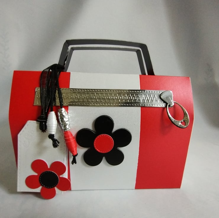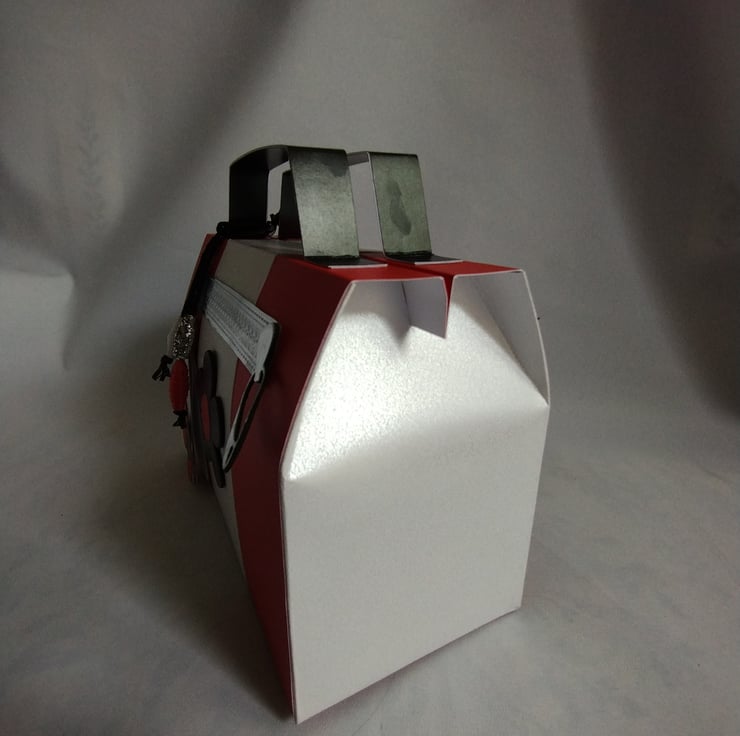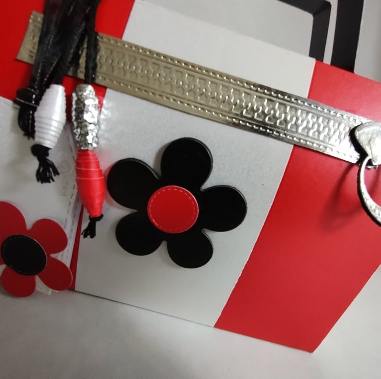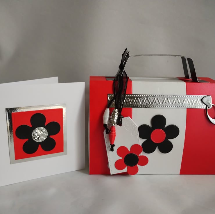 Made from premium quality pearl finish cardstock the gift box is top opening and has matching tags for you to write your message. The red and white colour block style is complemented by a five petal daisy making this a homage to all things retro 1960s and iconic designs of the time, adding to the detail are a silver cardstock faux zip and matching paper beads.