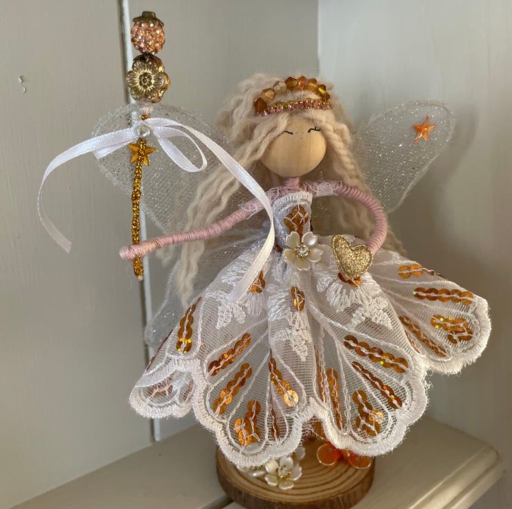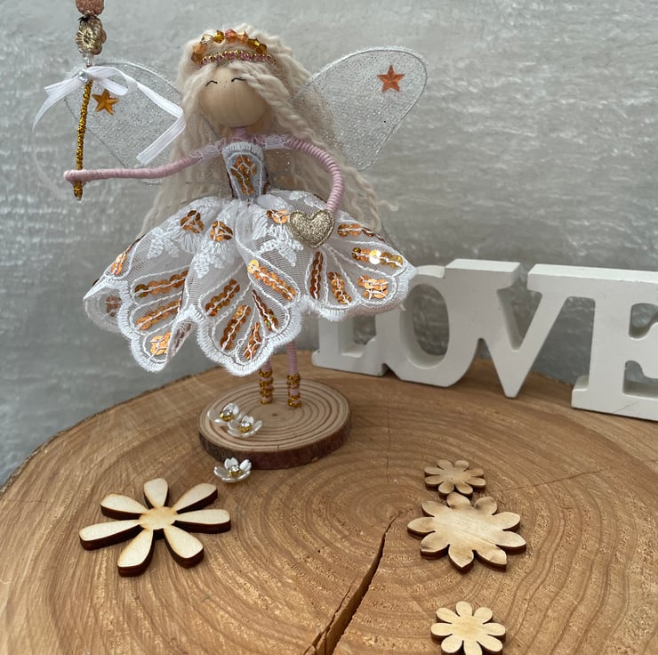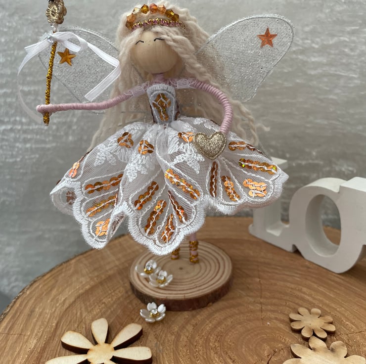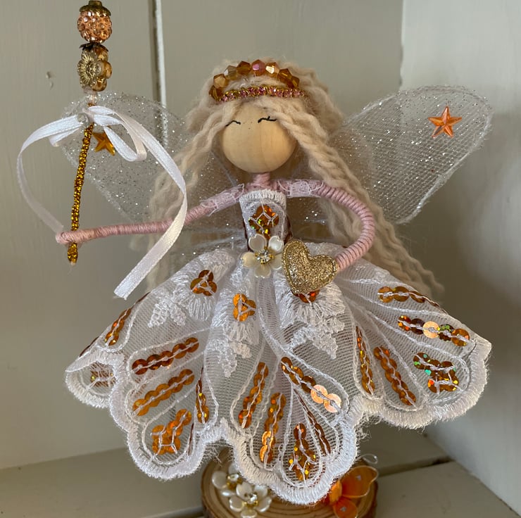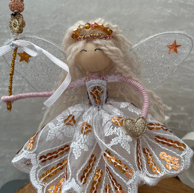 Her beautiful white and gold lace dress sparkles with gold sequins and in her long wavy hair sits a handmade beaded tiara. In her hand sits her beaded gold fairy wand ready to cast a magic wish with a sparkly heart in her other.