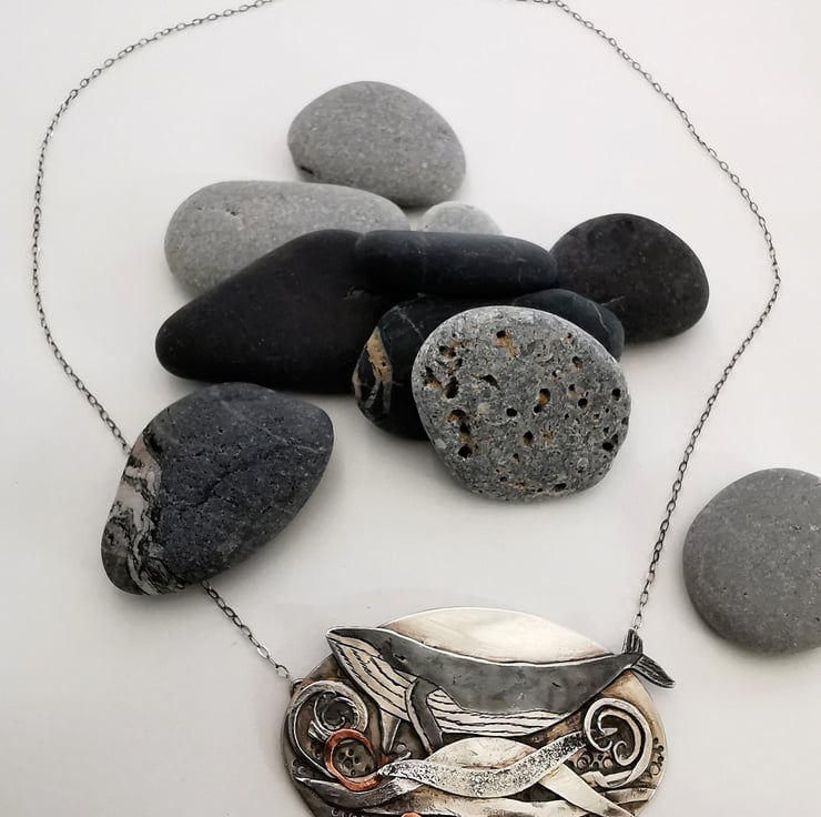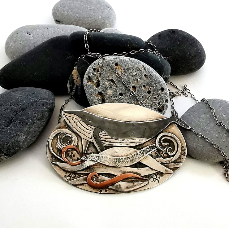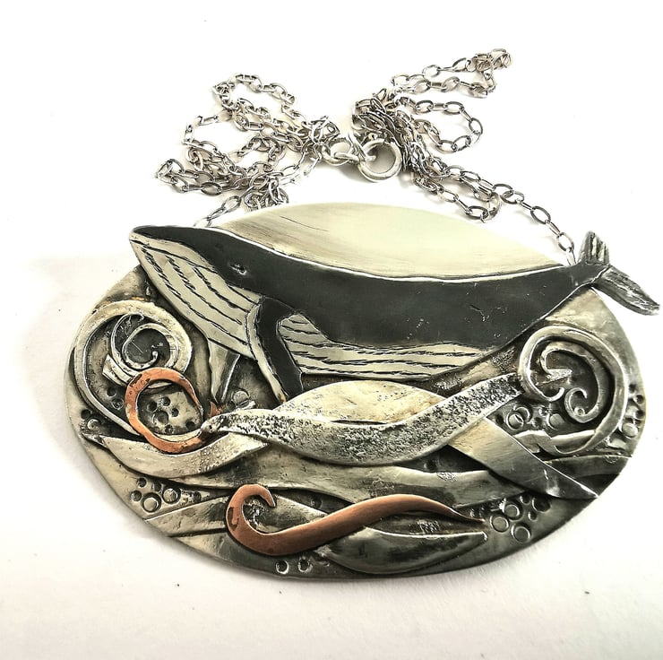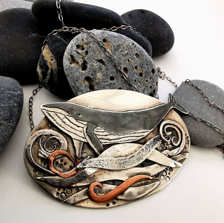 Sterling silver pendant of a whale frolicking in silver, copper and brass swirling waves. All of my work is hand fabricated using recycled sheet sterling silver, copper and brass and everything is meticulously hand sawn, filed and sanded to create a piece of jewellery that is unique and creates a story. I like to create pictures in mixed metals.