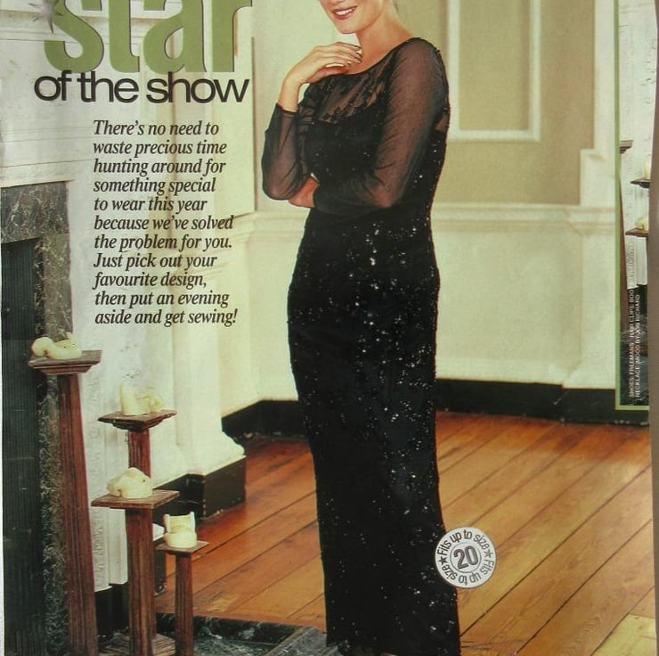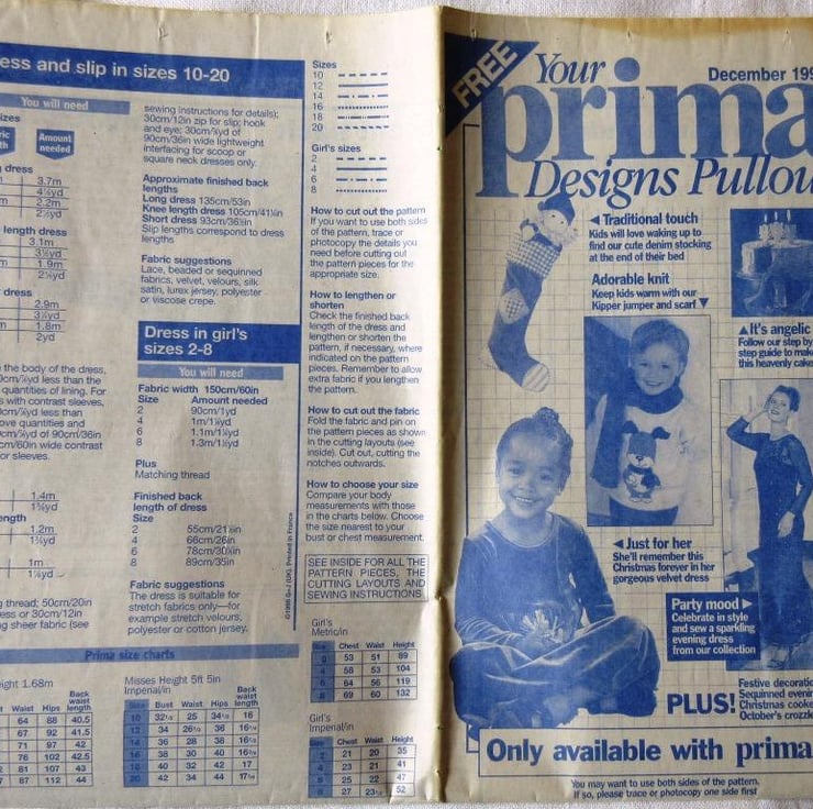 A vintage multi-size sewing pattern for a woman's evening/party dress in sizes 10 - 20 (bust 32.5"/83 cm - 42"/107 cm) and a little girl's party dress in sizes 2 - 8 (chest 21"/53 cm - 27"/69 cm, Prima December 1998). The woman's dress can be made in full-length or knee-length versions with a choice of scoop or square neckline and long sleeves. It can be lined or unlined and worn over the strappy slip, which can also be worn on its own. The little girl's dress has scoop neckline, long sleeves and full skirt gathered on to above-the-waist bodice. The pattern sheet also includes templates and some instructions for Christmas crafts (angel, star, stocking etc) athough I don't have all the instructions or coloured pictures for all the other crafts. PLEASE NOTE: the cutting layouts and sewing instructions are printed on the pattern sheet.