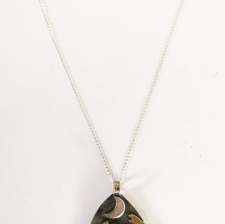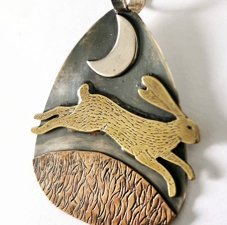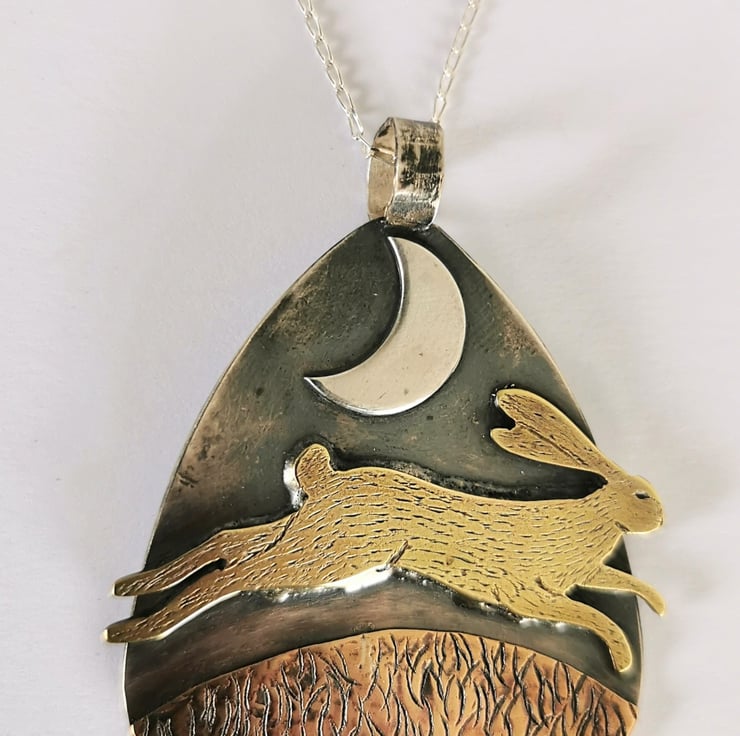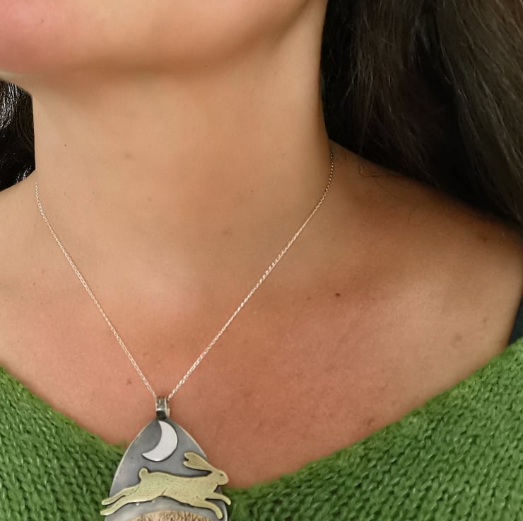 The mystical hare running and leaping under a crescent moon, sterling silver pendant with engraved brass hare under a silver crescent moon. The pendant hangs from a sterling silver chain.