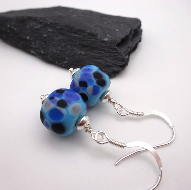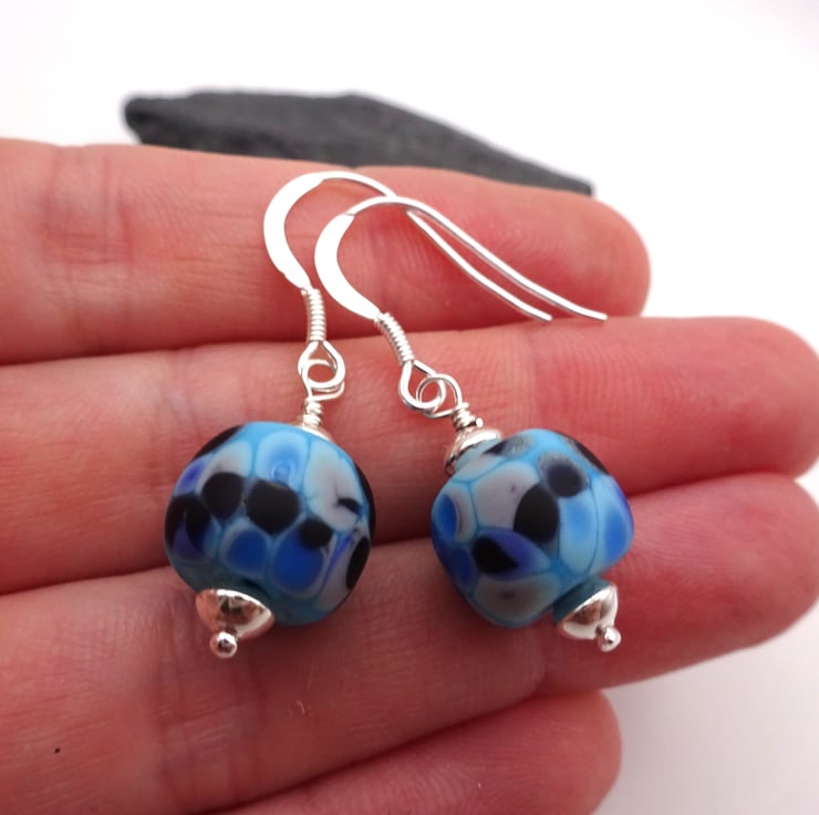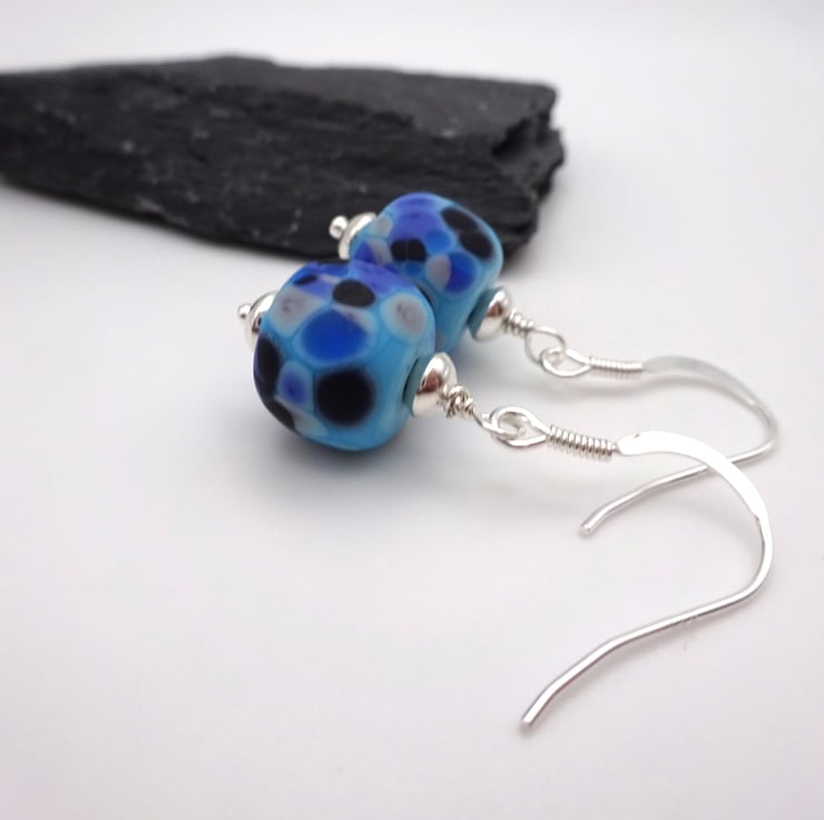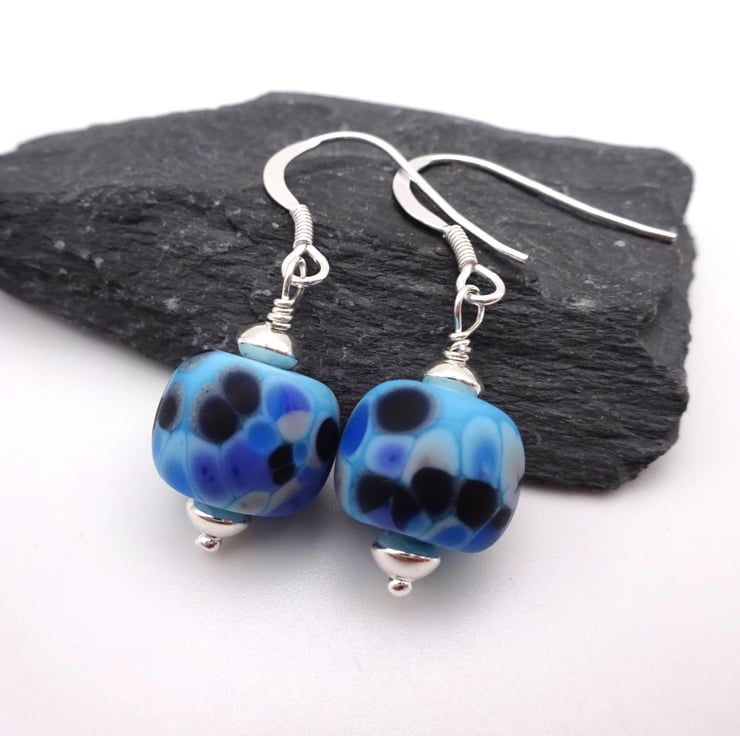 A pair of earrings made with sterling silver ear wires and handmade lampwork glass blue beads.