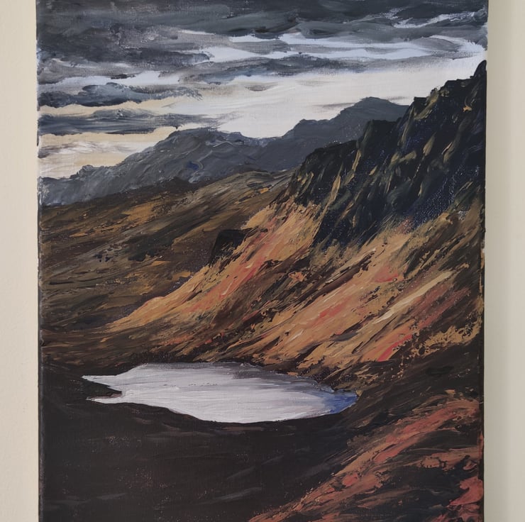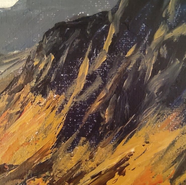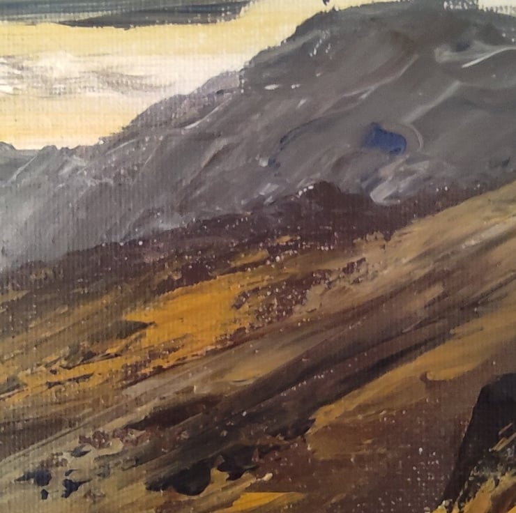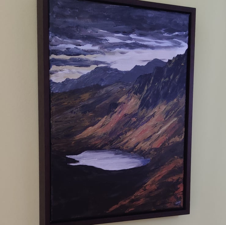 Painted in acrylics using mainly a pallet knife onto a thin stretched canvas with the sides painted black. It can be framed or just hung as it is, the string is already in place.