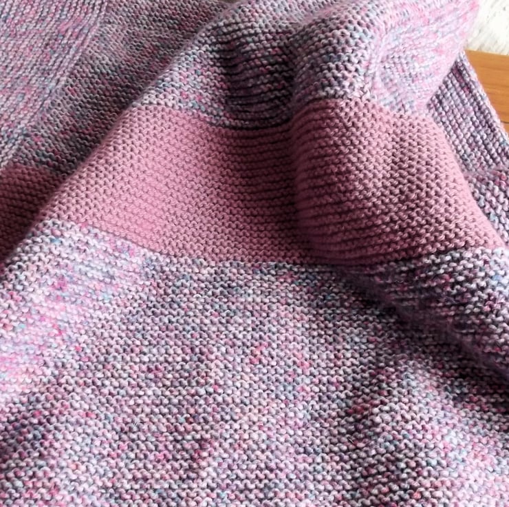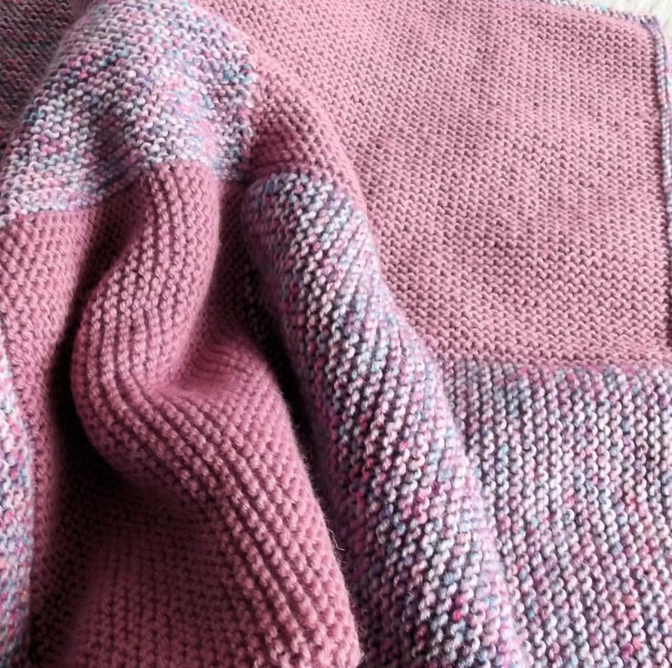 Hand knitted by me. Pinks Log Cabin Style Cot Blanket. Measures 100cm (39 inches) by 67cm (26 inches). Knitted in medium weight acrylic blend yarn. hm64