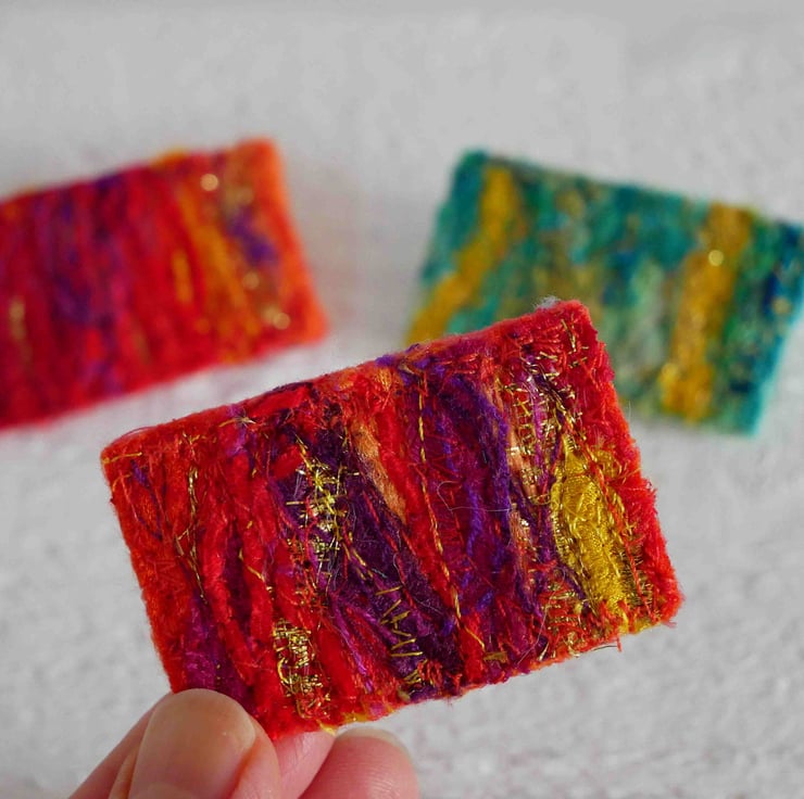A bright colourful embroidered textural brooch pin, created in a mix of fabrics in zingy colours.