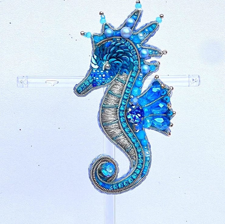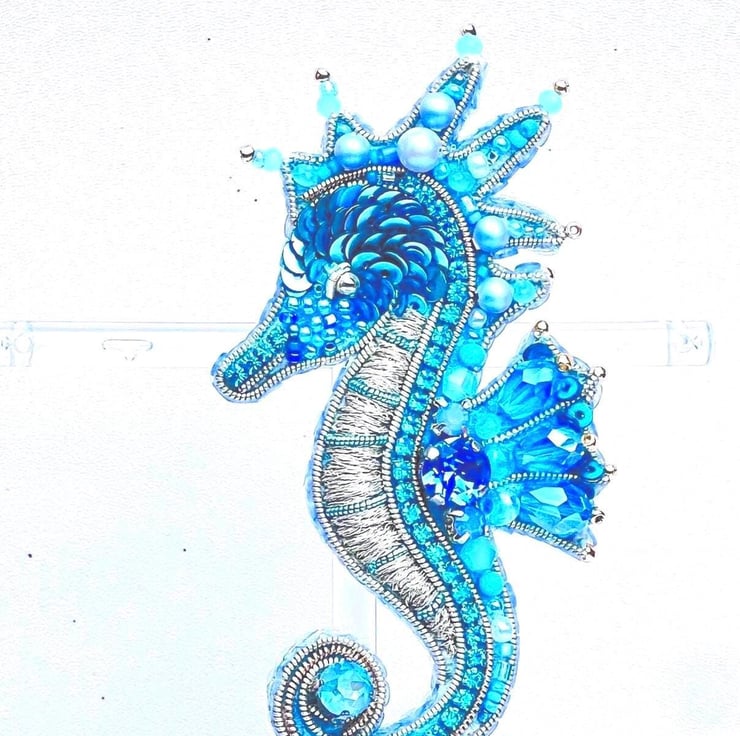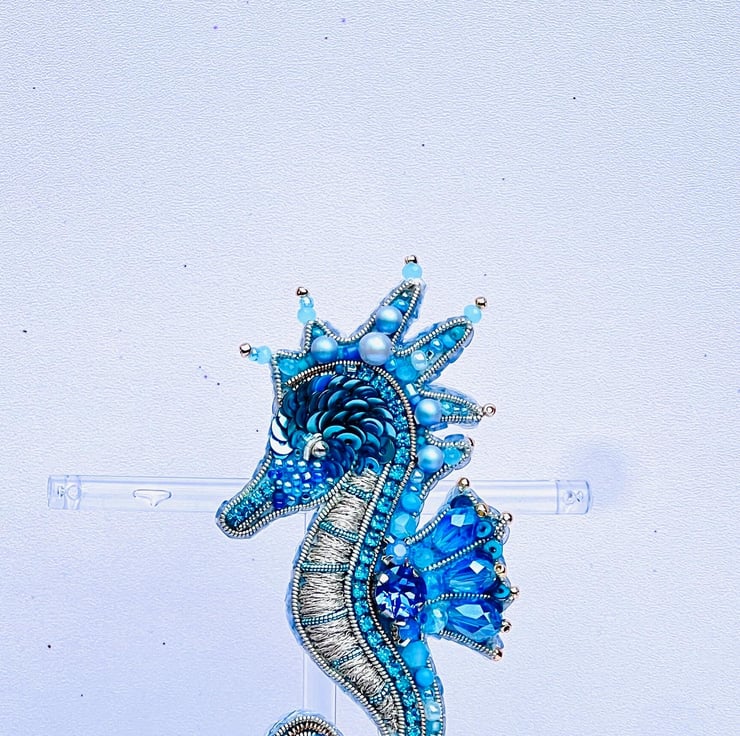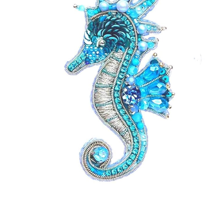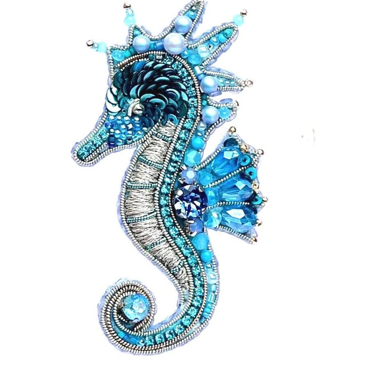 Elegant handmade beaded seahorse brooch featuring sparkling crystals, sequins, and beads in oceanic shades of blue. This marine-inspired brooch is perfect for adding a touch of unique charm to any outfit. Lightweight and meticulously crafted, it s a statement piece that works for formal events, casual outfits, or as a thoughtful gift for sea life enthusiasts. Carefully handcrafted with premium materials, it ensures durability and elegance. A perfect accessory for jackets, scarves, or dresses.